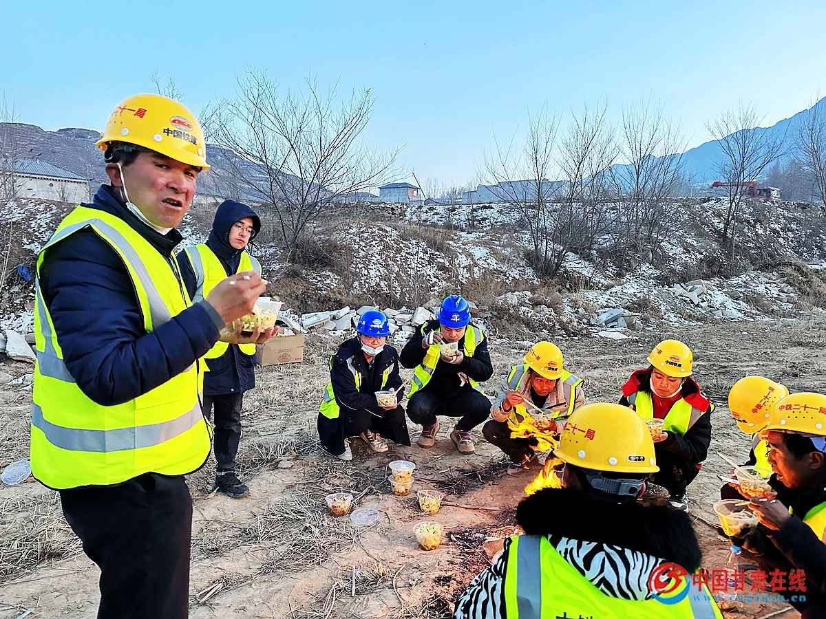 “孩子感冒,发高烧几天了……媳妇怪着呢……”项目总工王云龙说完,头也不回的带着技术员匆匆奔赴大河家镇的大墩村七社的安置点上。“面都坨了,能吃吗?”送饭的人员关切地问。“能吃啊!”一名测量员蹲在地上,僵硬的手指笨拙地转动筷子,笑着说。由于安置点远,交通不便,饭送到了不是冻住了,就是坨成一片。“灾情就是命令,时间紧迫,没有多余的时间。”这句话已经成为他们的口头禅。