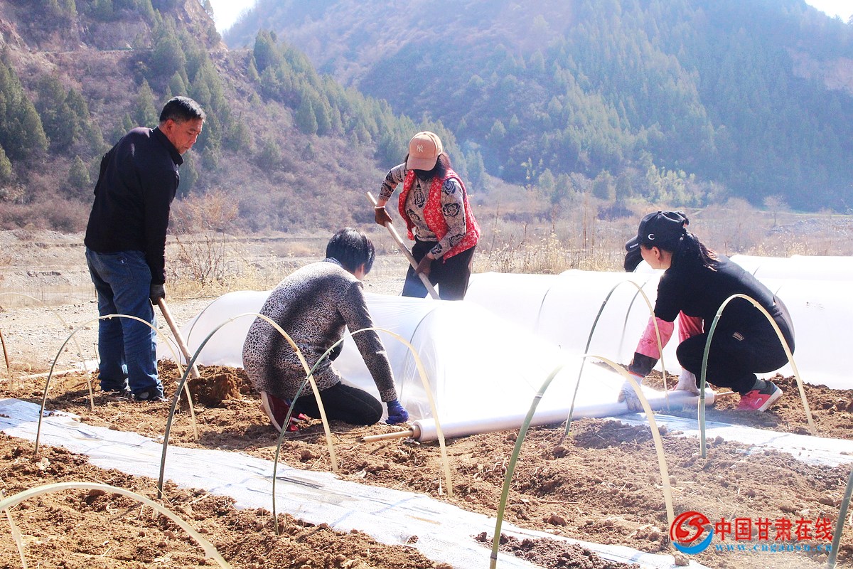 中国甘肃在线徽县讯(通讯员:马育江)春回大地、万物复苏。时下,正是春耕备耕的关键时节,走进徽县永宁镇庙湾村千亩架豆产业种植基地,村民们正忙着覆膜、覆土,忙的不可开交,一垄垄覆好膜的农田在阳光照耀下宛如银丝带环绕在山间。