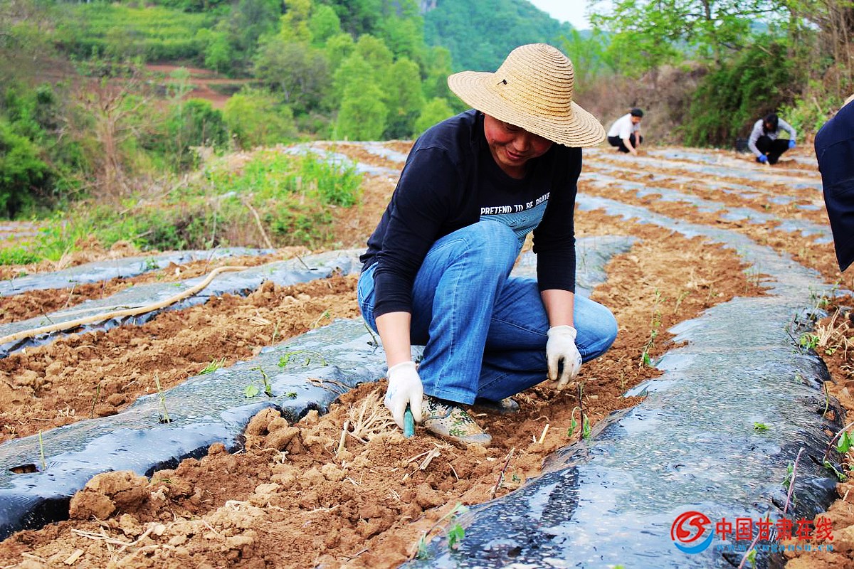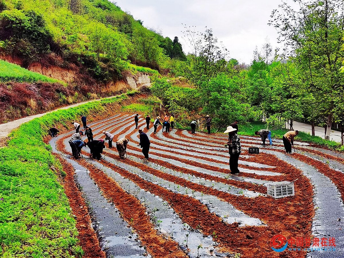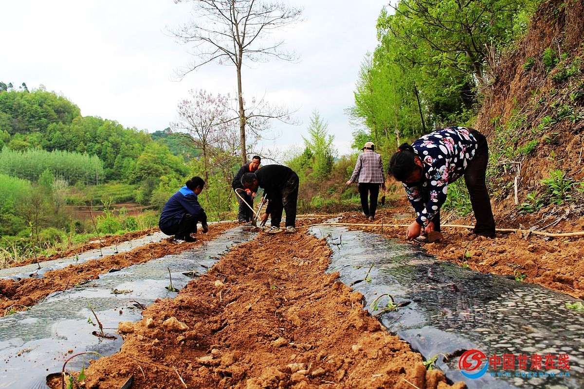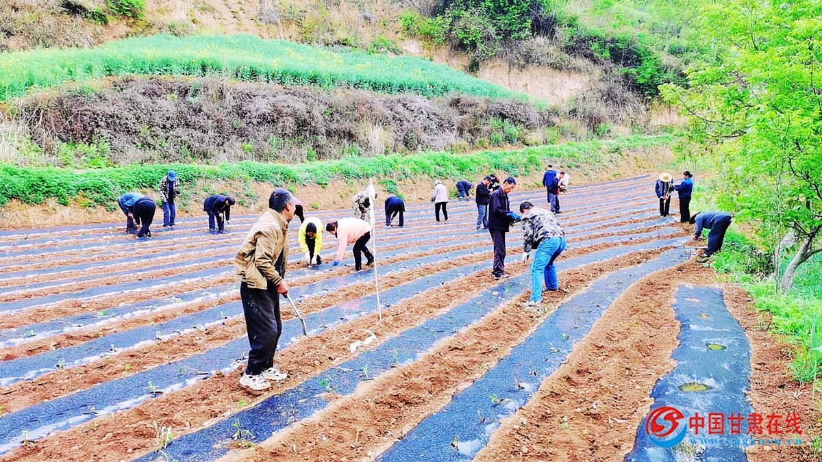 中国甘肃在线两当讯 近日,在两当县兴化乡槐树村田间地头,20多位农民正在作业,他们一字排开,沿着覆好膜的田垄,将亳菊苗栽进土壤,苗子栽种以后,另有部分农民抓紧浇水。栽种、浇水、封土……现场分工明确,忙而有序,村民们忙碌的身影和一株株娇小青翠的菊花幼苗相映衬,构成了一幅产业兴旺的画面。