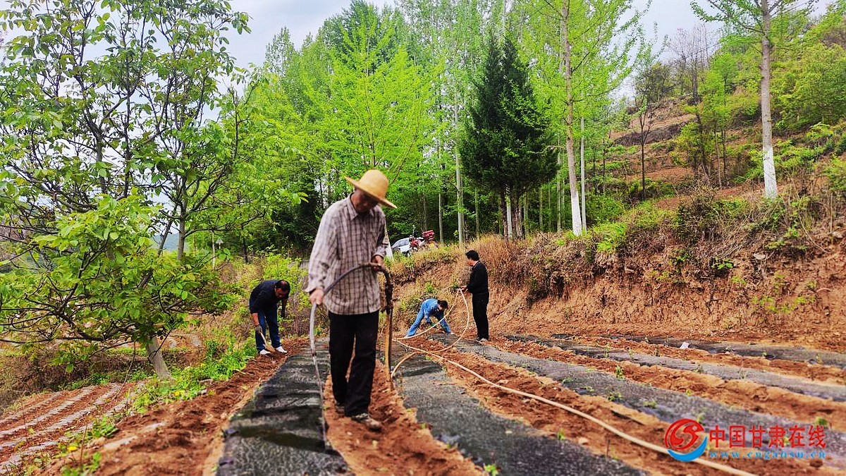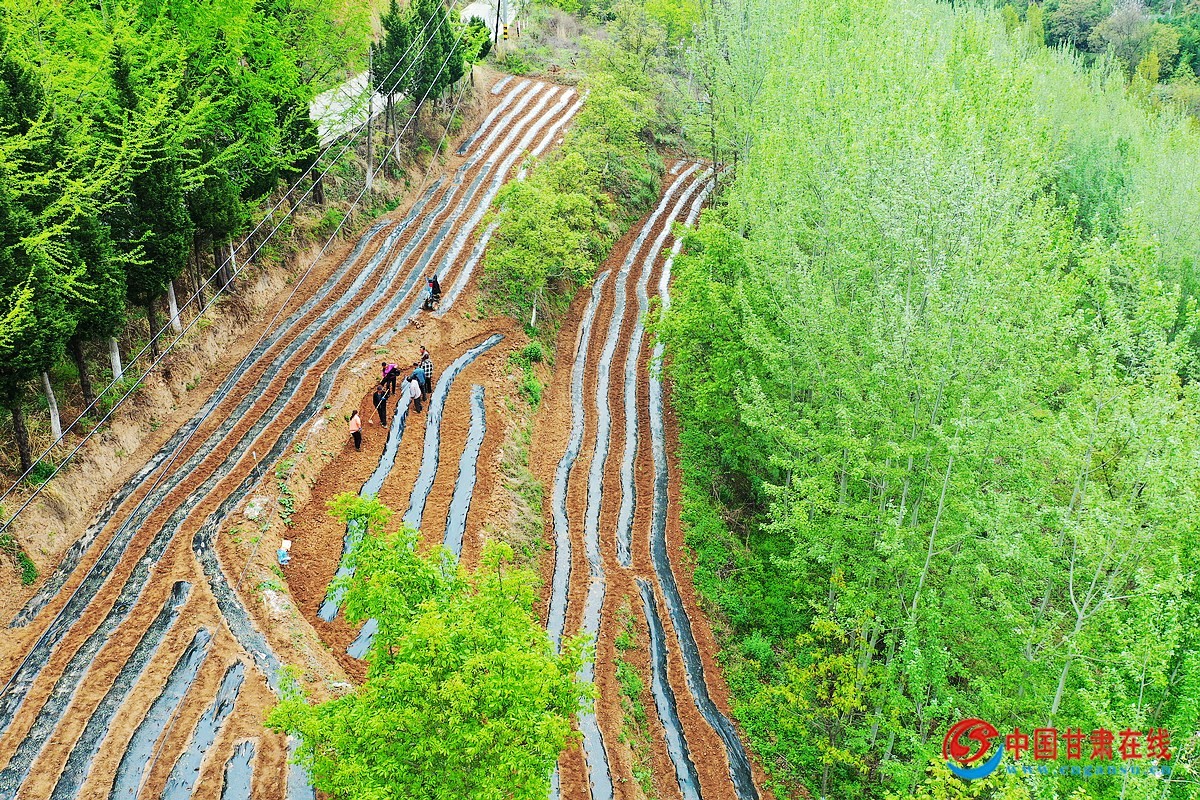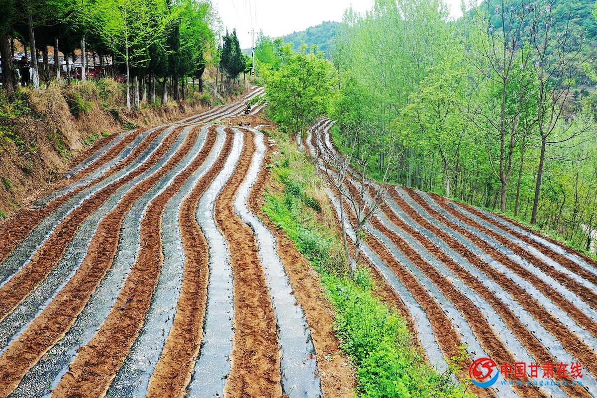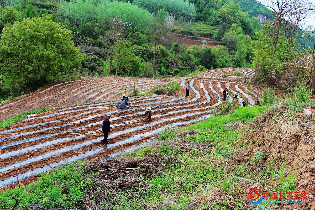 中国甘肃在线两当讯 近日,在两当县兴化乡槐树村田间地头,20多位农民正在作业,他们一字排开,沿着覆好膜的田垄,将亳菊苗栽进土壤,苗子栽种以后,另有部分农民抓紧浇水。栽种、浇水、封土……现场分工明确,忙而有序,村民们忙碌的身影和一株株娇小青翠的菊花幼苗相映衬,构成了一幅产业兴旺的画面。
