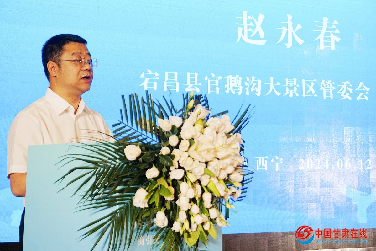 6月12日,甘肃陇南宕昌县文化旅游宣传推介暨招商引资推介会在西宁市拉开帷幕。宕昌县官鹅沟大景区管委会副主任赵永春向西宁游客发出邀请。