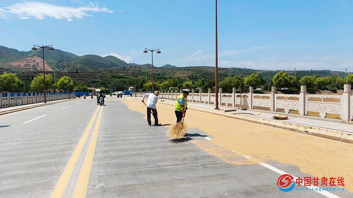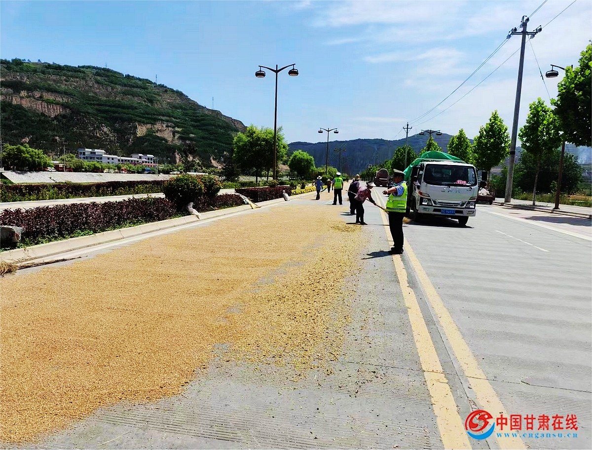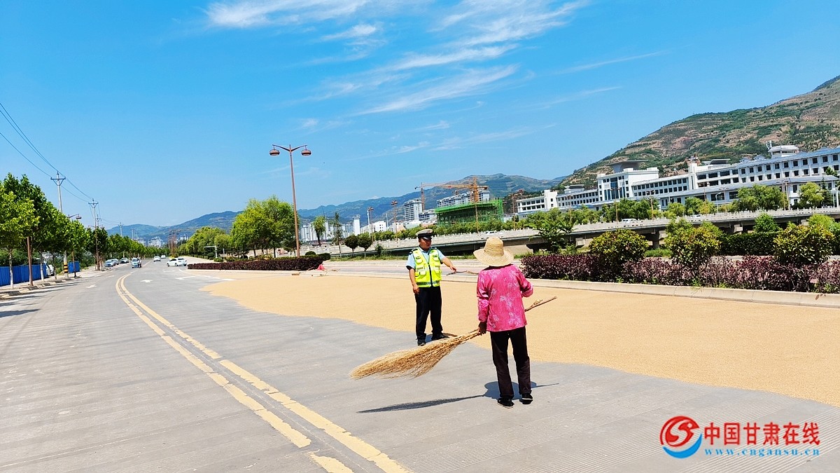 中国甘肃在线礼县讯 眼下正值夏收季节,不少村民已经在公路上开始“圈地运动”,把公路当成“晒粮场”,礼县公安局交城交警大队民警在日常巡逻工作时,发现辖区有村民在机动车道上晾晒粮食,影响过往车辆和行人正常通行,存在交通安全隐患。