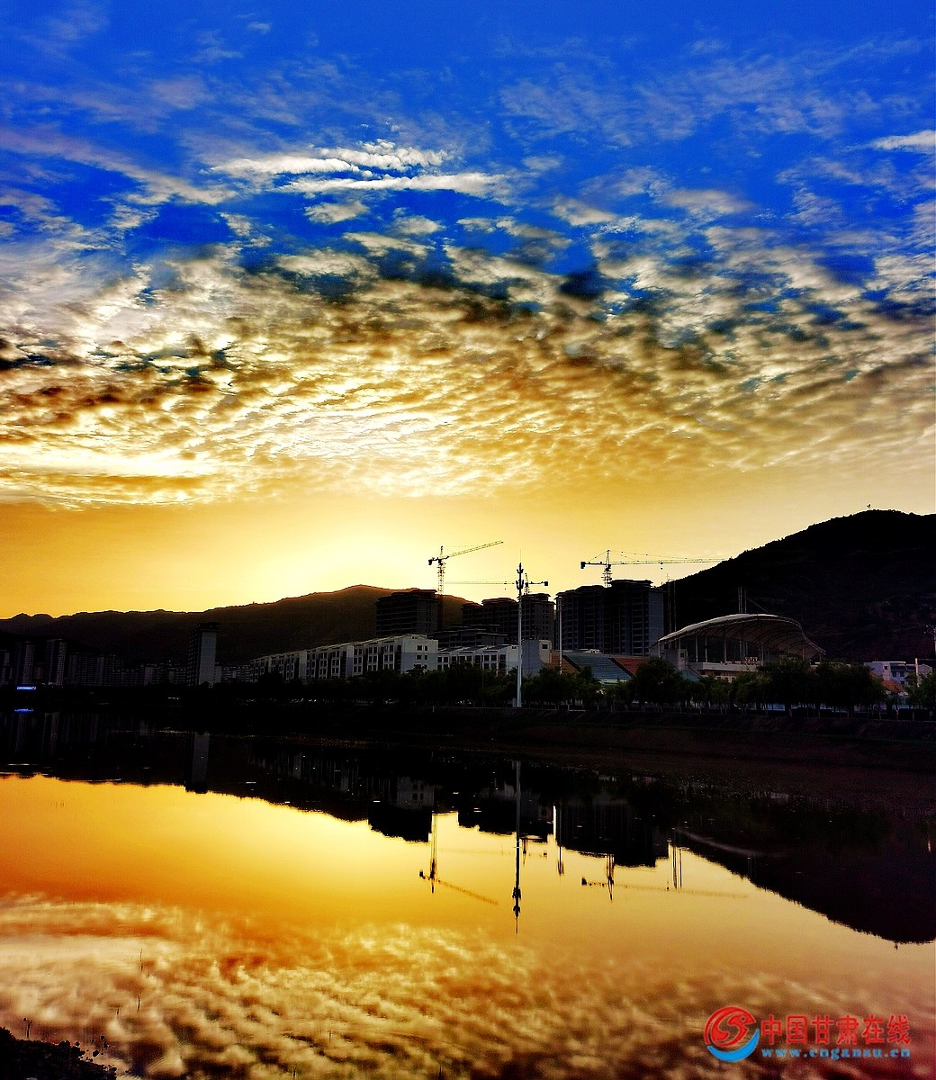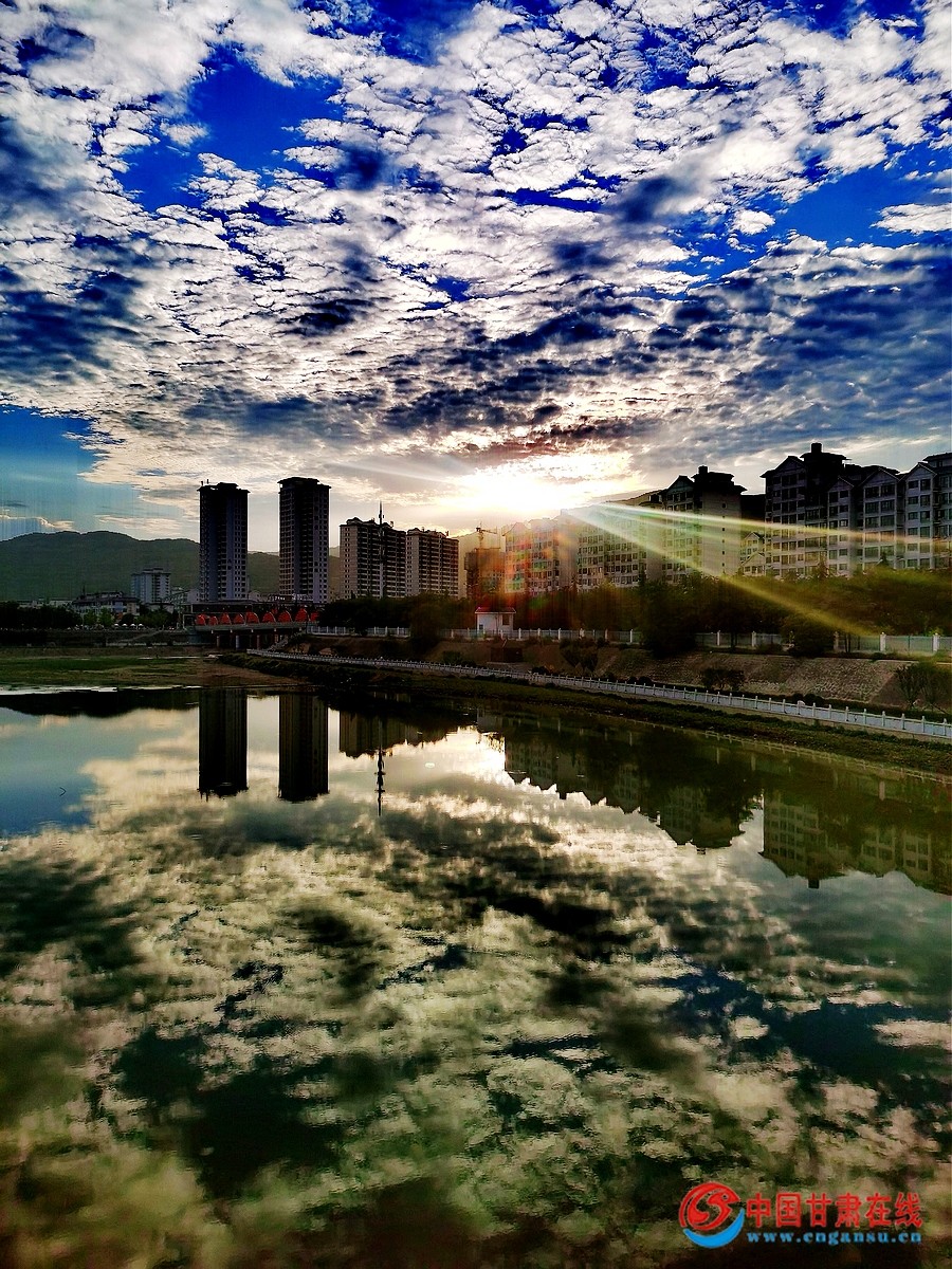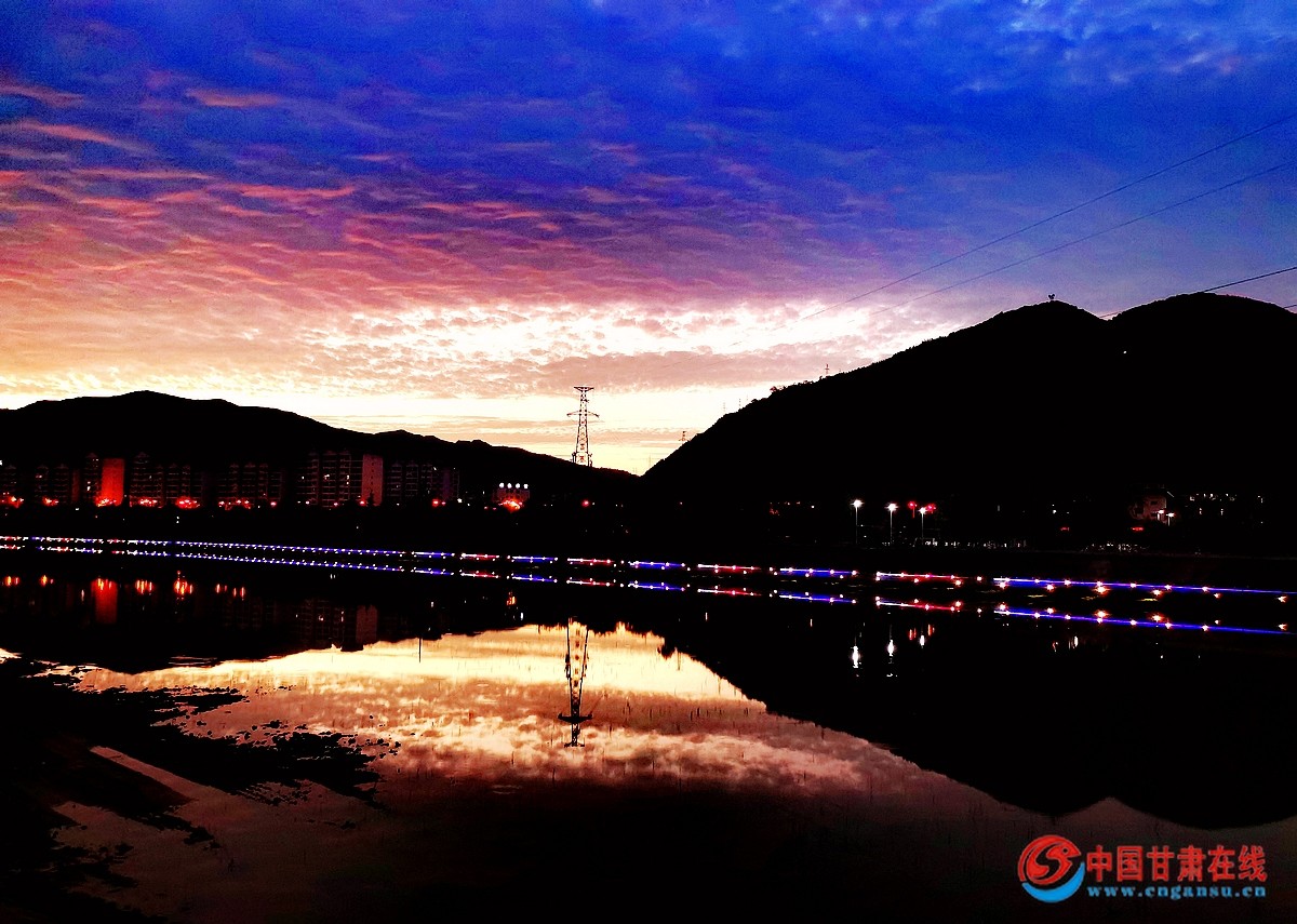 中国甘肃在线礼县讯 盛夏之际,临近傍晚,夕阳西下,金色的光晖将湛蓝色的天空晕杂得耀眼斑斓,洁白的云朵镶上美丽的花边。天边出现了火烧云,那红的像火的霞光映在辽阔的西汉水河水面上,像铺上了一层玫瑰色的光辉,犹如一面发光的镜子,清水碧蓝潋滟,河边绿油油的水草扭动着它们婀娜的腰肢,仿佛跳着热情的舞蹈,欢迎人们的到来。