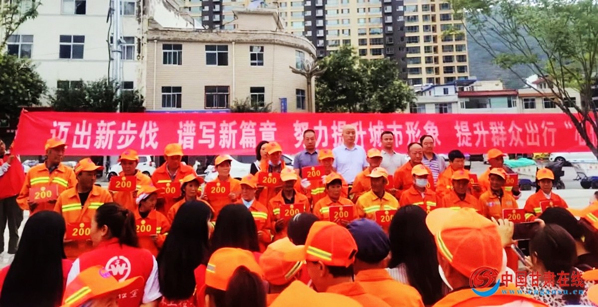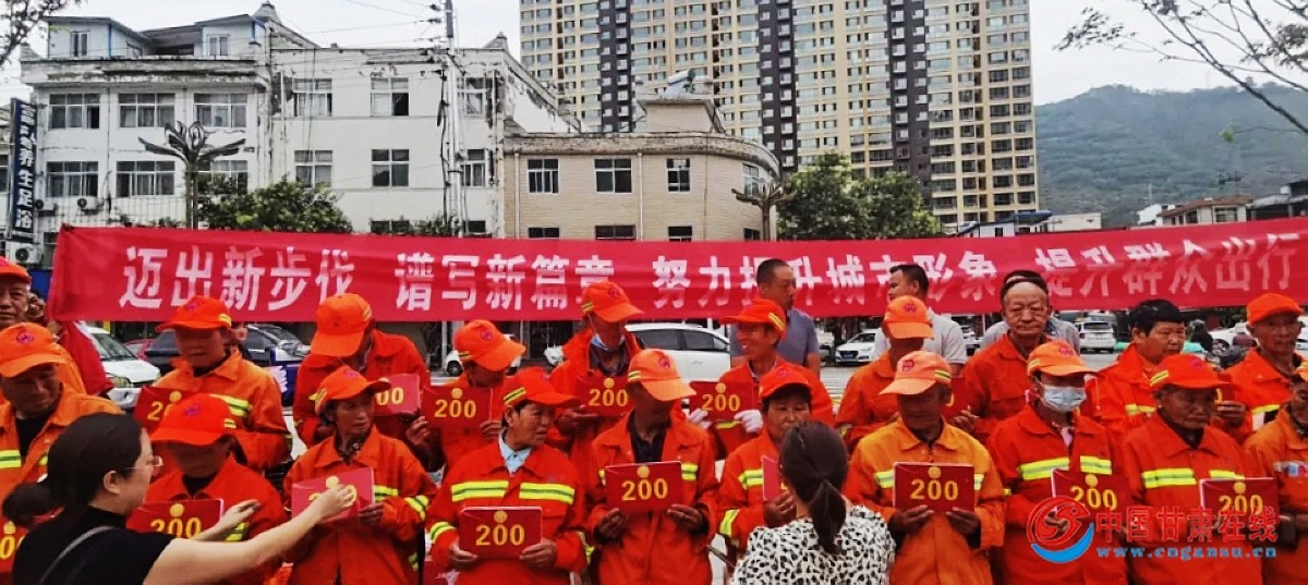 中国甘肃在线宕昌讯 “太好了,这活干得越来越有劲儿啦。”8月10日上午,在宕昌县岷江人行步道小广场环卫所绩效考核星级管理表彰大会上,拿到奖金的53名环卫工人高兴得合不拢嘴。
