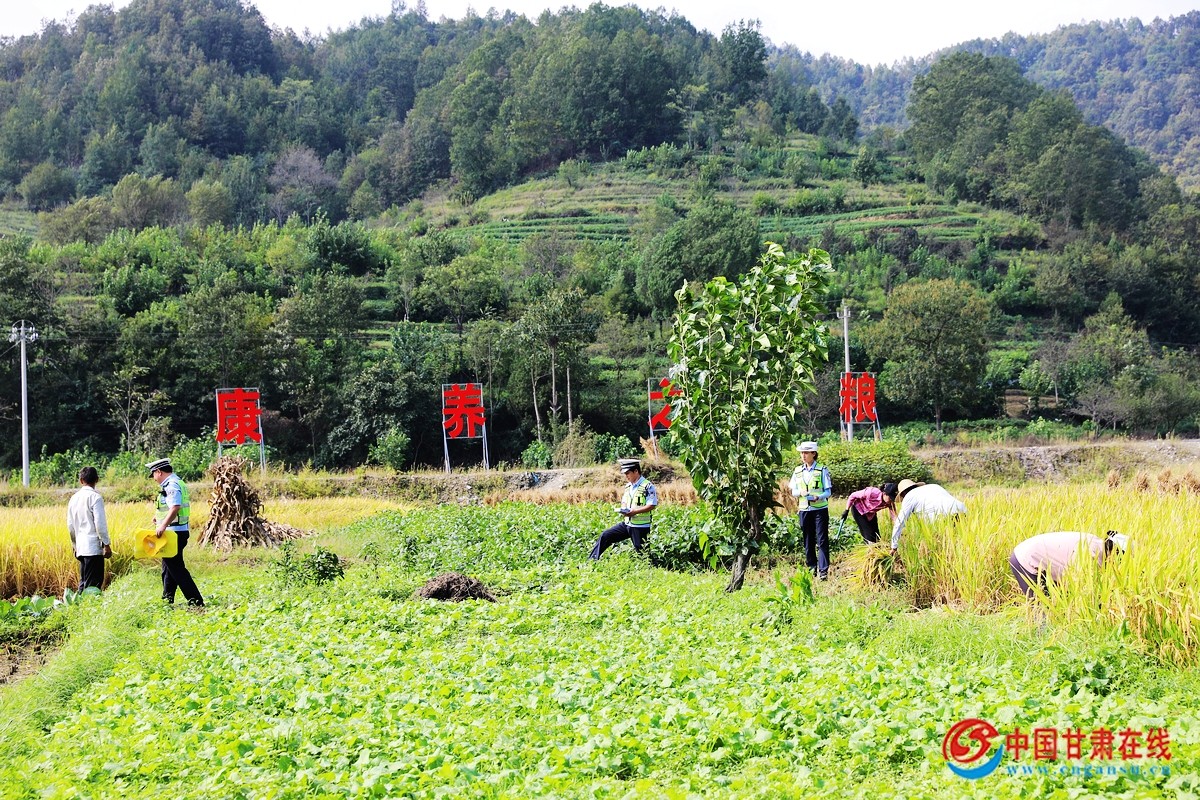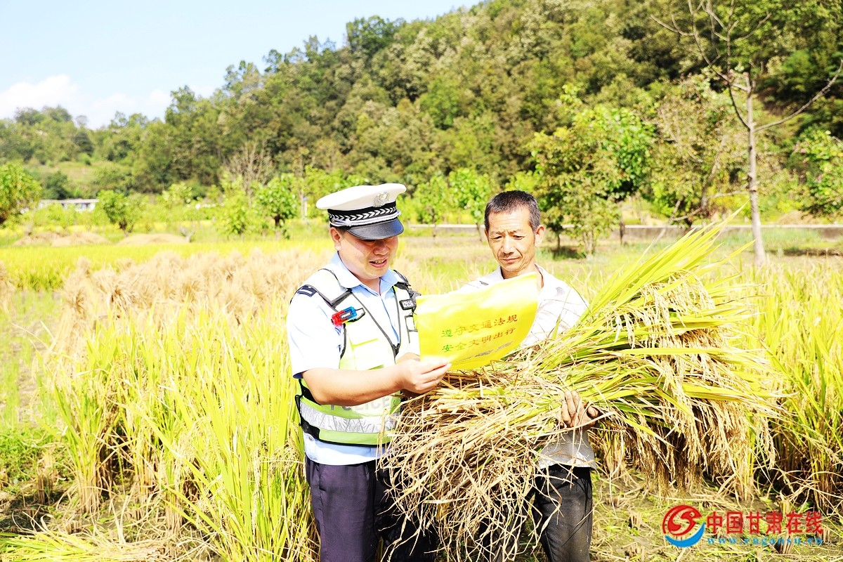 中国甘肃在线康县讯(通讯员:张菁)“春种一粒粟,秋收万颗子。”金秋时节,田野的金黄一望无垠,丰收的喜悦催人奋进,农民抢抓晴好天气忙收割。9月18日,康县公安局交警大队组织宣传小分队会同云台中队民辅警到大南峪镇花庙村开展“美丽乡村行”交通安全宣传活动。