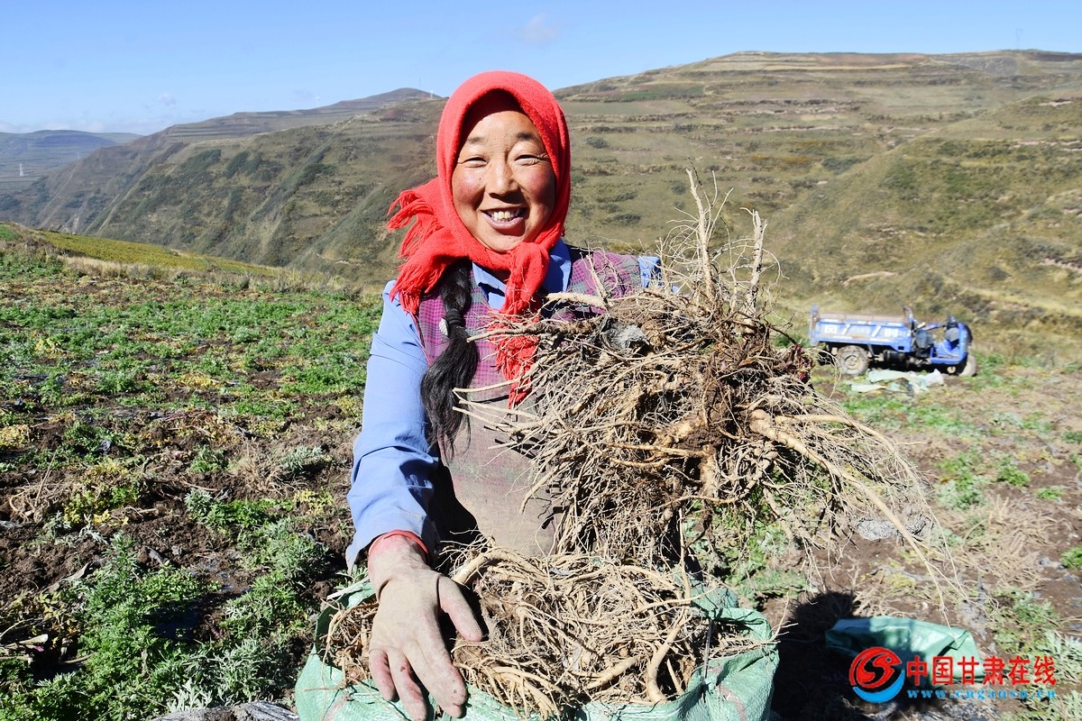 中国甘肃在线宕昌讯 金秋十月,当归飘香。宕昌县阿坞镇东沟梁机械穿梭,人声鼎沸,药农们忙着采挖、收捡、装车,现场一派丰收的喜人景象。