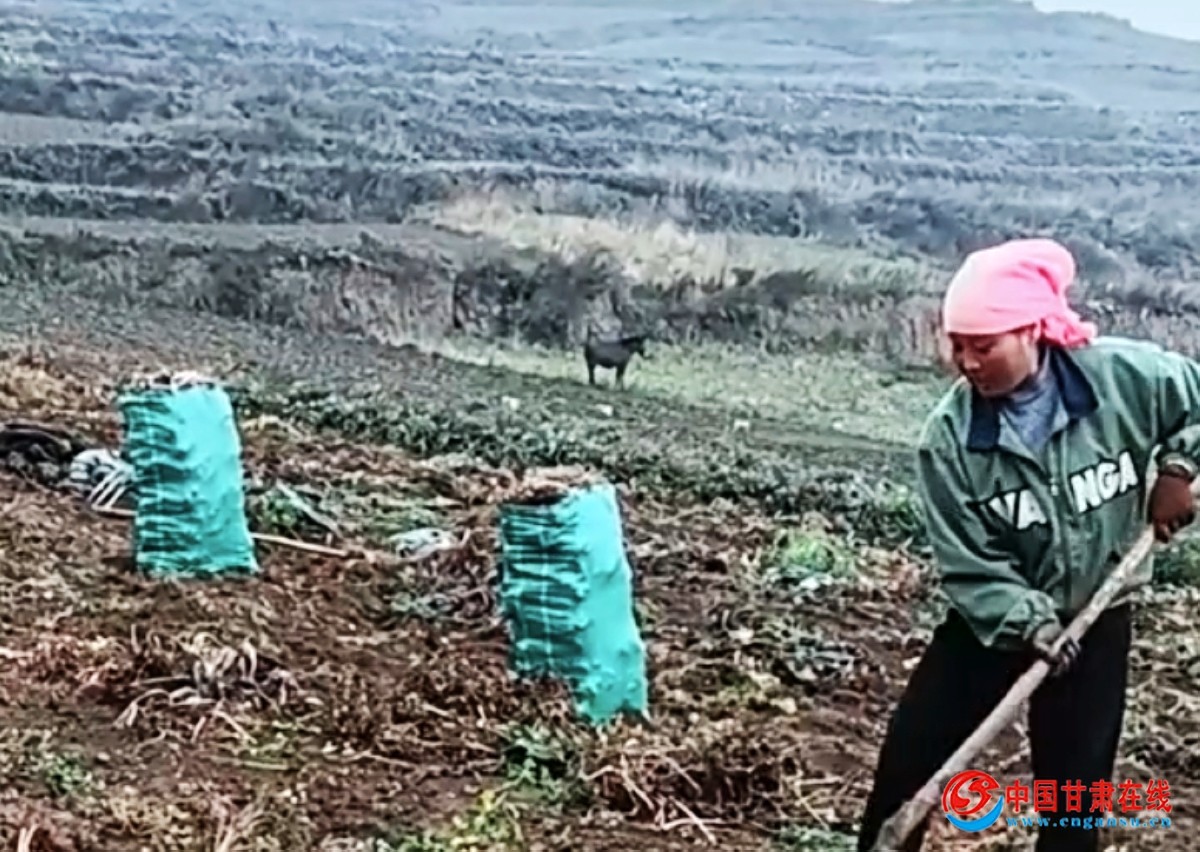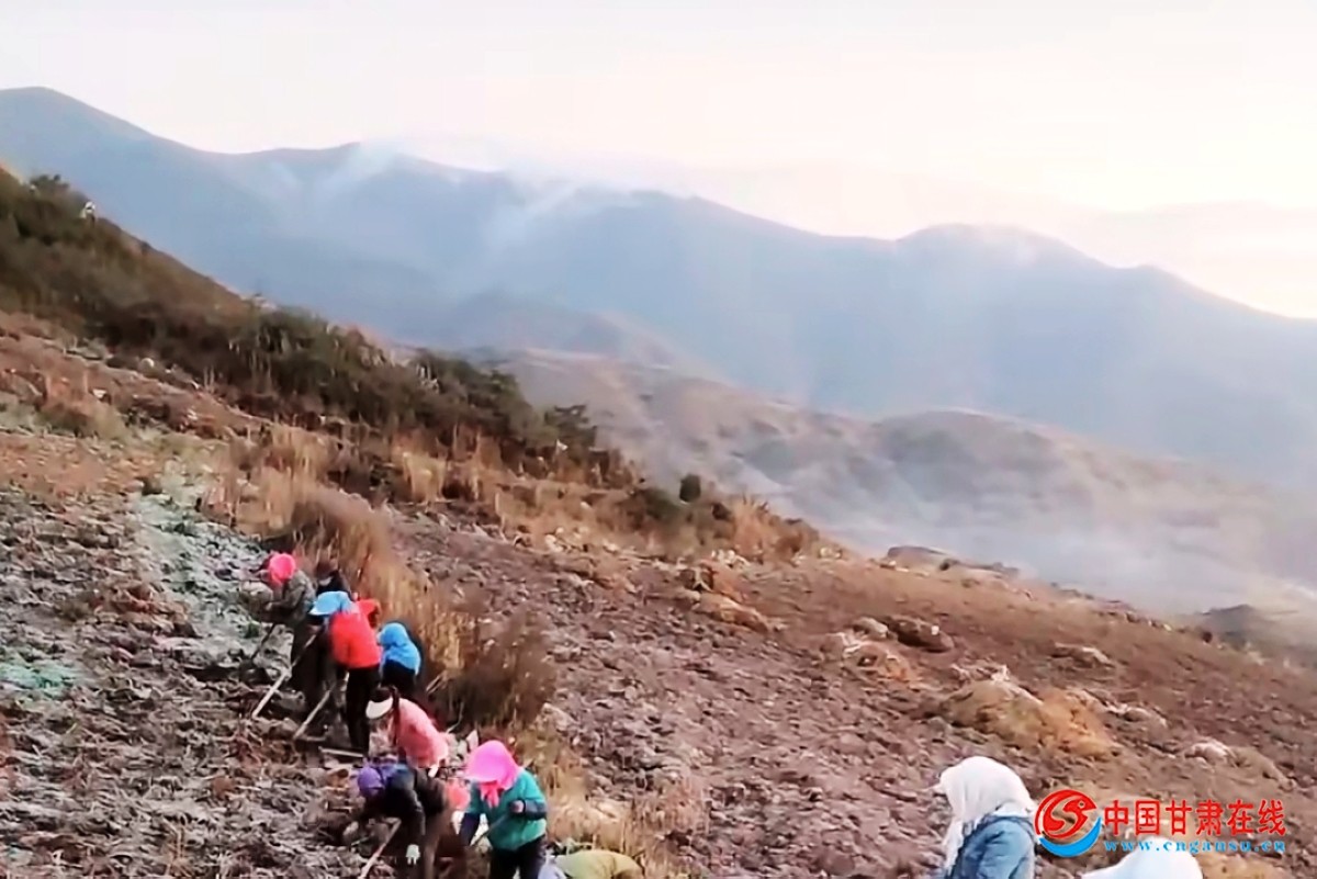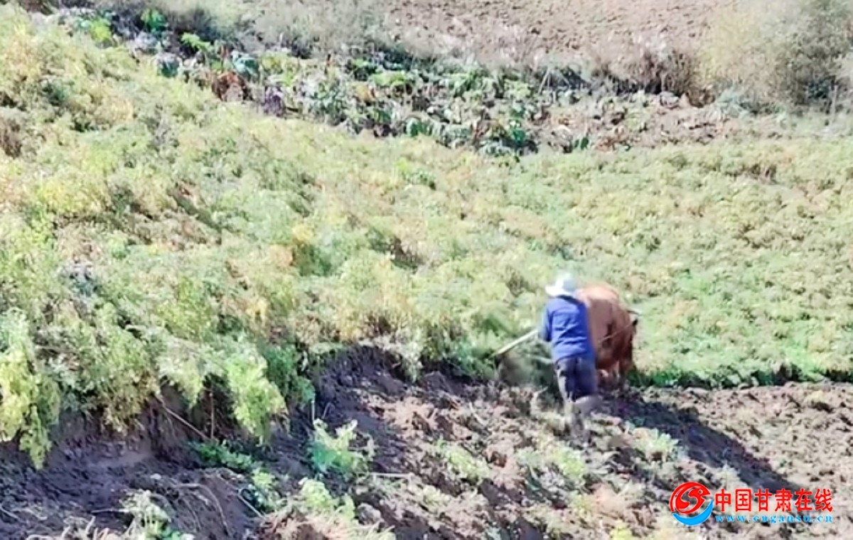 中国甘肃在线宕昌讯 寒霜染药乡,采挖正当时。节令“霜降”正是中药材采收的黄金期,地处陇南金马池缘的宕昌狮子乡四条村,山地到处是犏牛犁耕,人工捡装,三轮车来回穿梭,药乡人家正在忙碌采收当归。