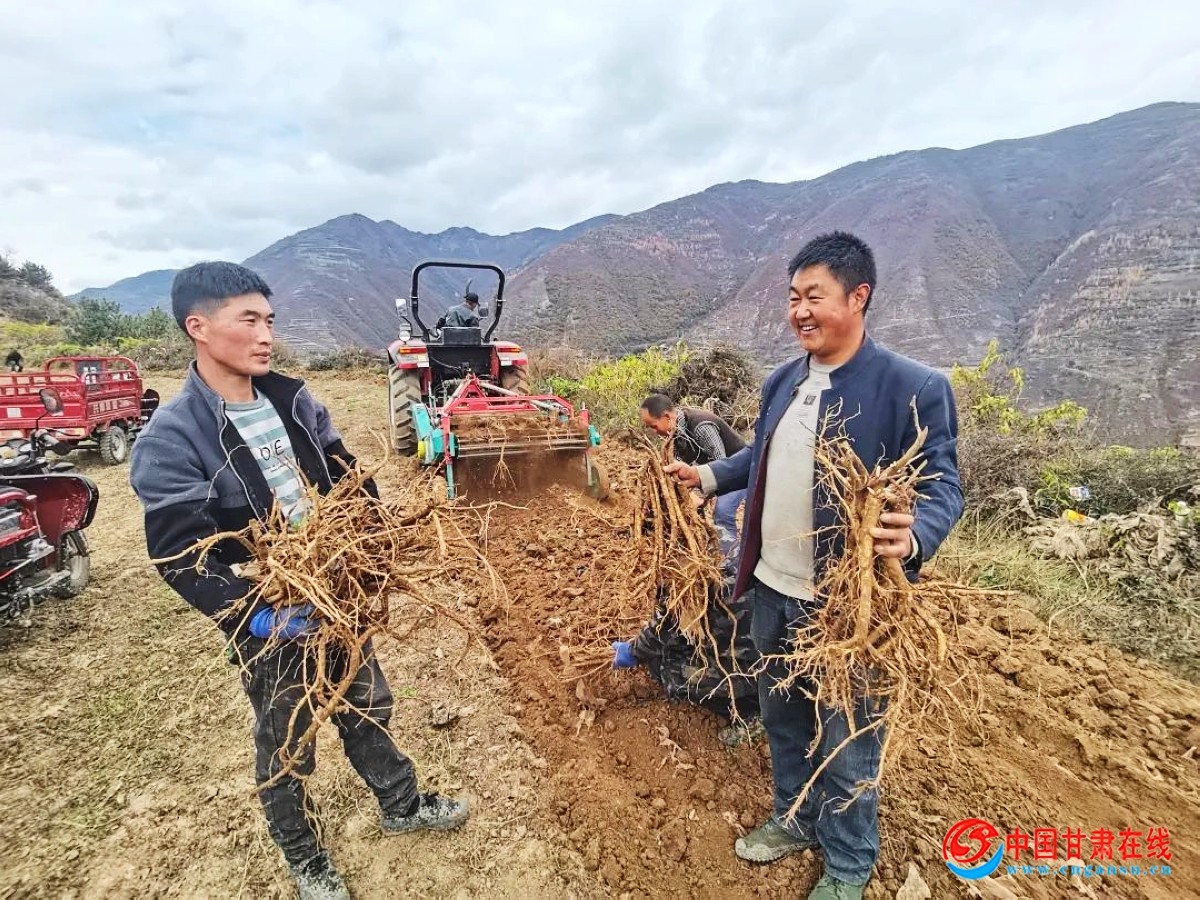 中国甘肃在线宕昌讯 冬日药飘香,田间采收忙。眼下,在宕昌县吾族村百亩中药材种植基地里,药农正在抢收晾晒黄芪、党参中药材,到处都是“晒”丰收、忙增收的火热画面。
