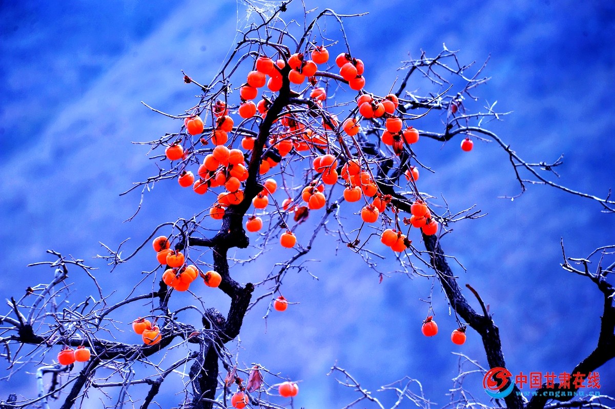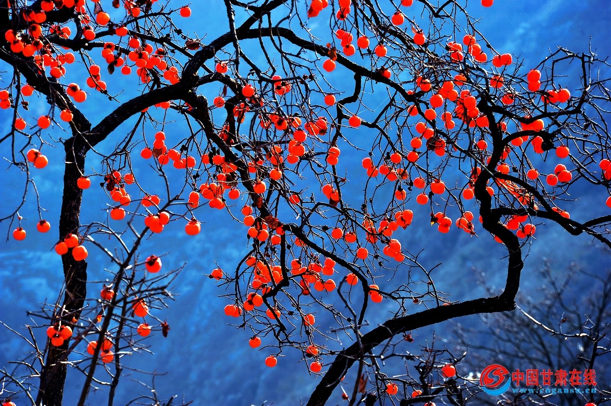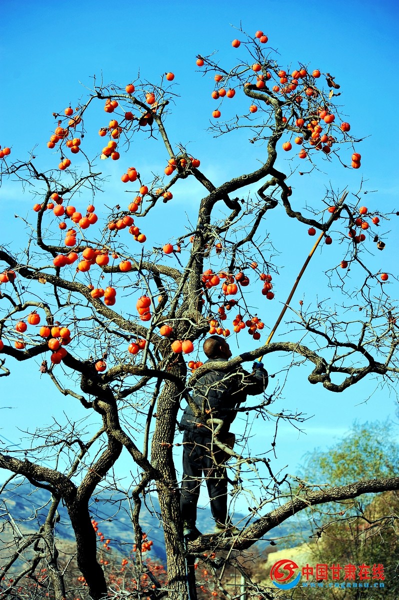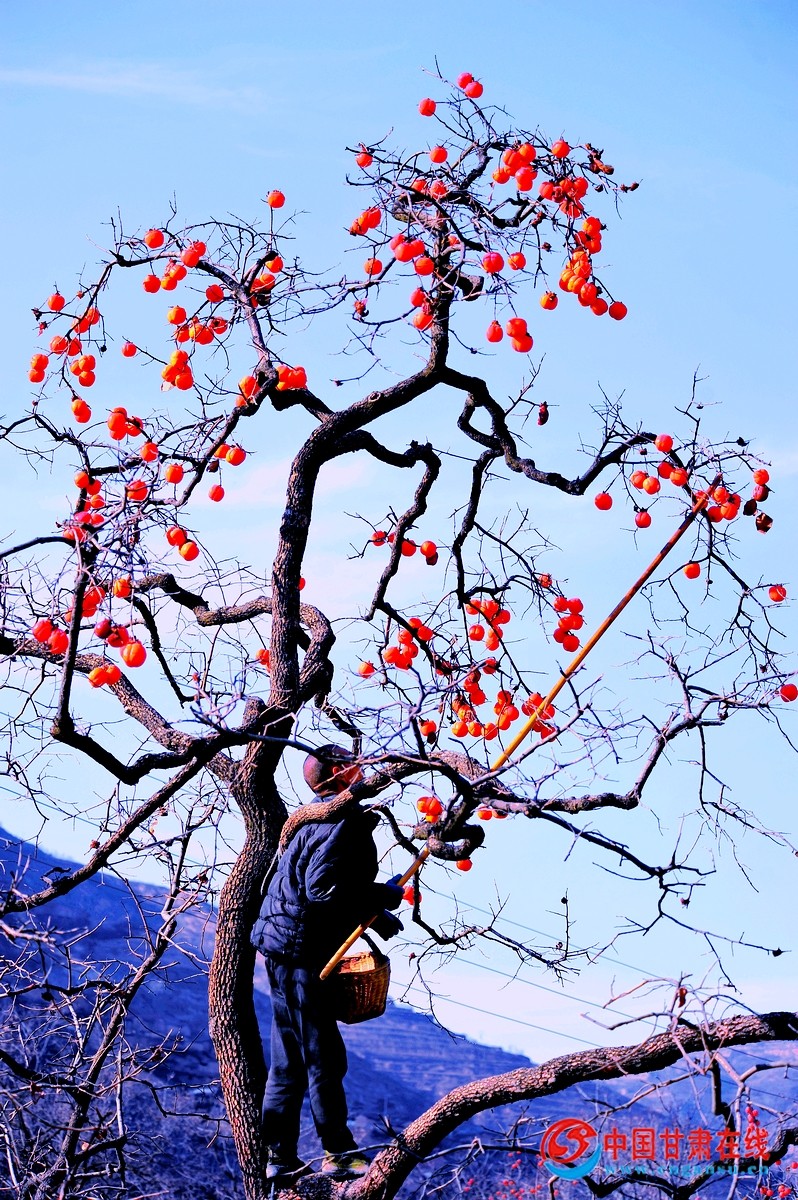 中国甘肃在线礼县讯 “色胜金衣美,甘逾玉液清”。11月27日,时入冬月,在礼县龙林镇李那村的袁各坝组,村民们正采摘成熟的柿子。当地百年的老柿子树上红艳艳的柿子,像一盏盏红红的灯笼,压弯了笔直的枝条。那颗颗红红的柿子,在寒风中摇曳舞动,犹如一面面小红旗在招展,分外俏丽惹眼。