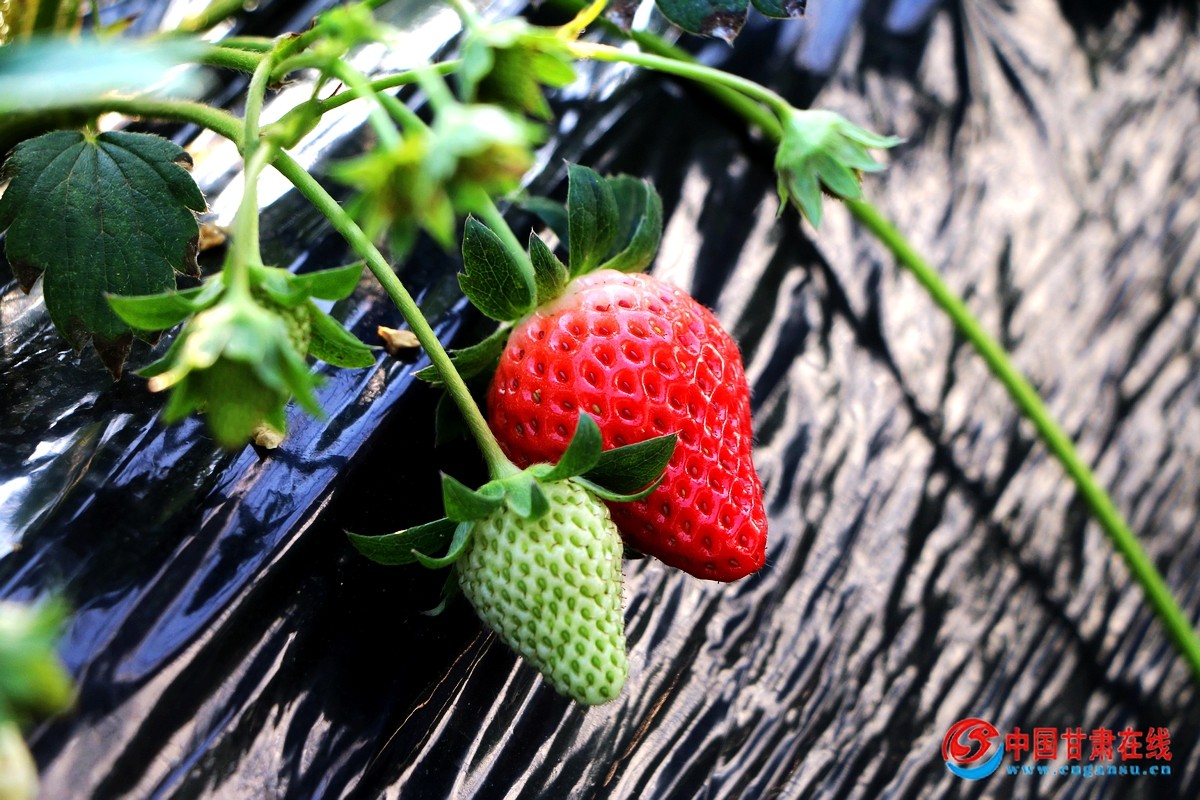 中国甘肃在线礼县讯 12月1日,礼县石桥镇索迈现代农业产业园区连栋温室内的头茬草莓正在陆续成熟,抢“鲜”上市。目前,该园区草莓已陆续进入收获期,因具有果型正、口感酸甜、营养价值高等特点,深受消费者和前来观光采摘的游客青睐。 薛小平 摄