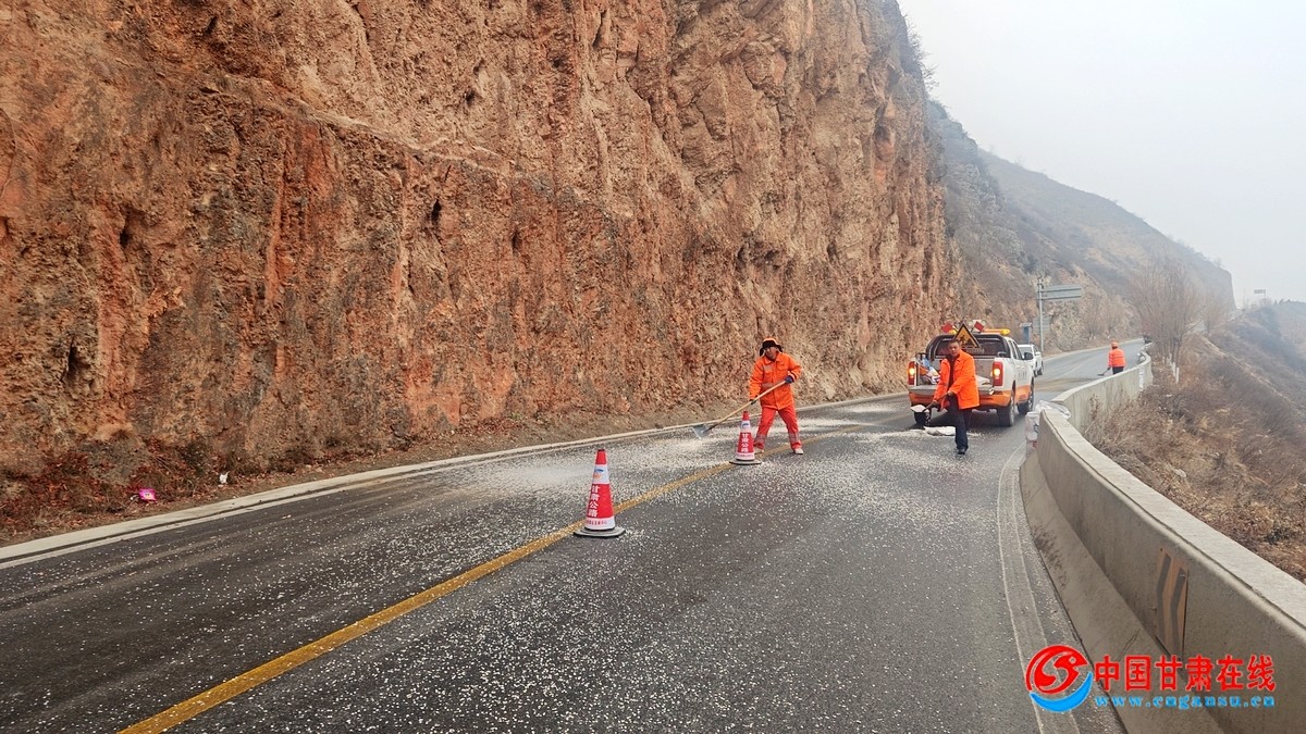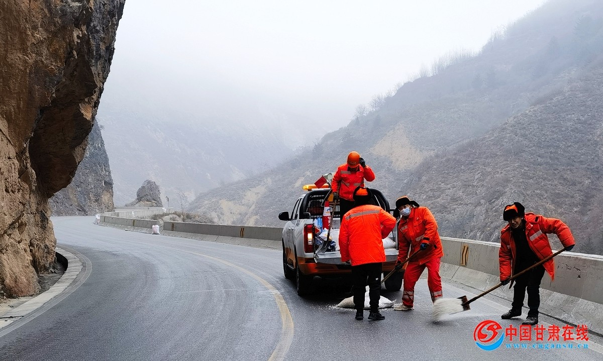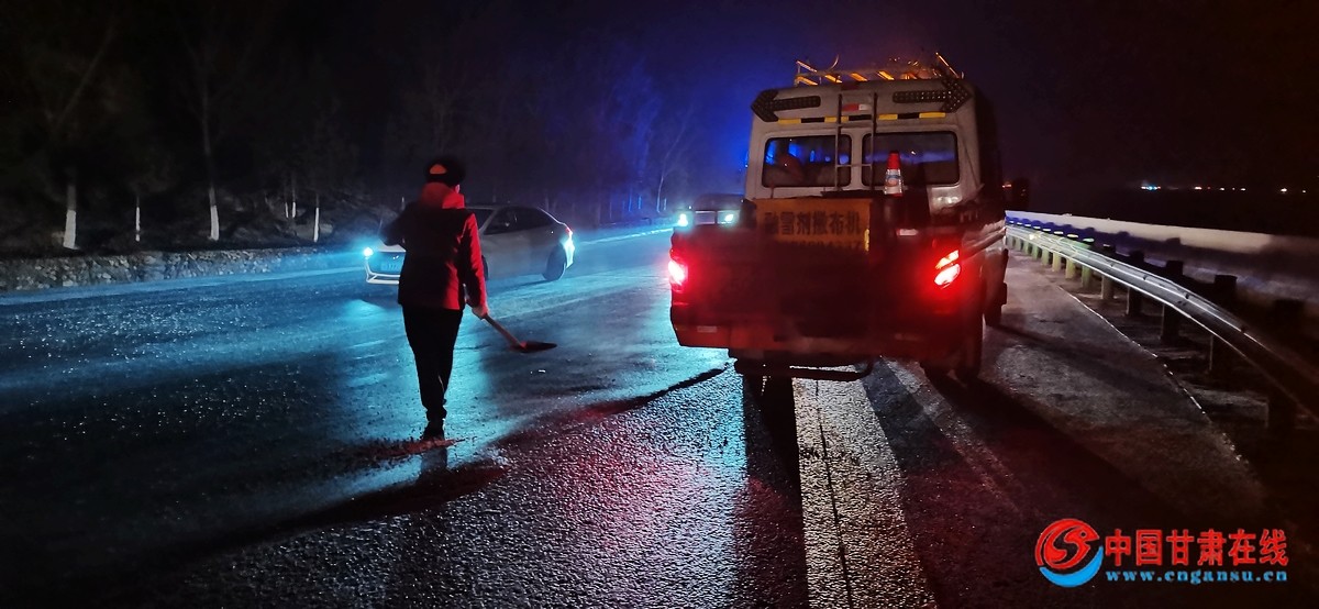 中国甘肃在线礼县讯 1月17日下午17:00许礼县境内气温骤降,天空不时飘起雪花,瞬间落地变成冰花,正是农历四九天气,面对突如其来的降温。礼县公路段立即启动《冰雪天气应急预案》,各防滑点积极行动起来动,装备融雪剂、防滑料。人员机械连夜奔赴G247线、G316线、省道208线,挑灯夜战防滑保畅。落实除雪保畅“十个务必到位、44条工作要点”和“十个强化”要求,坚持贯彻“除雪为主、融雪为辅、破冰保底”的总策略,坚持领导跟班代班制。确保安生产开了势持续稳定。开展“人工十机械”相结合防滑作业。对急弯、陡坡、易结冰、易打滑重点路段,撒融雪剂、人工清除。重点路段釆取“一处一方案”细化防滑保畅措施。树立早发现、早应对、早处置的思想工作理念。为人民群众创造“平安春运、便捷春运、温馨春运”的路域环境。全力应对极端恶劣天气,打好公路除雪保畅“主动战”“关键仗”。全力为人民群众平安出行,物流运输顺畅而保驾护航。