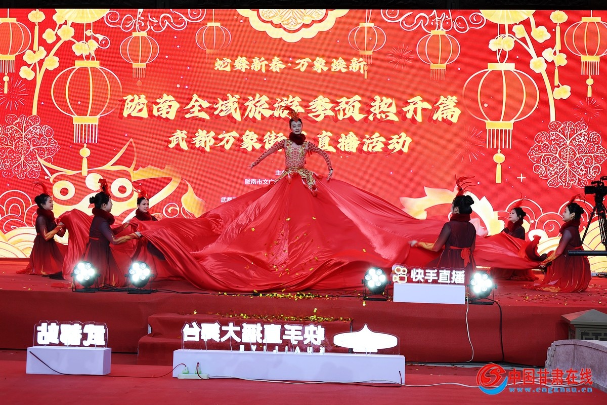 中国甘肃在线陇南讯(:张恺 李云帆报道)近日,陇南全域旅游季预热开篇暨武都万象街区直播活动盛大启幕。活动现场,各大主播齐聚万象街,现场演绎精彩不断,歌舞表演轮番上演,吸引了众多市民游客驻足观看。直播间弹幕滚动,主播与网友们实时互动,推介陇南及武都的美景美食和民俗文化。