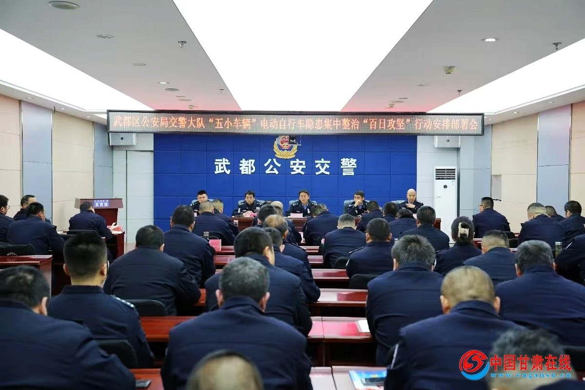 中国甘肃在线武都讯(通讯员:张林海)为了认真贯彻落实全市“五小车辆”电动自行车隐患集中整治“百日攻坚”动员部署会议精神,为全面加强“五小车辆”电动自行车及驾驶人管理,积极消除道路交通安全风险隐患。2月18日,武都区公安局交警大队组织召开“五小车辆”电动自行车隐患集中整治“百日攻坚”行动安排部署会议。会议由局党委委员、交警大队大队长张斐主持。大队班子成员、各部门负责同志在交警大队主会场参加了会议,城区、东江、快骑、乡镇中队全体民辅警在派出所分会场参加了会议。