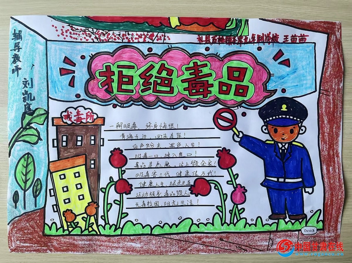 在禁毒知识讲座课堂上,思政课教师刘凯鹰利用精心制作的课件,以案释法,由浅入深为同学们详细宣讲了毒品的概念、特征和毒品对个人家庭及社会的严重危害,针对青少年学生特点,提出了远离毒品侵蚀的基本方法,同时要求同学们通过“小手拉大手,禁毒齐步走”影响带动身边小伙伴和家长共同参与禁毒斗争,努力构建平安无毒家园。在高年级学生中,同学们在指导老师的引导下,积极发挥个人智慧制作了以“健康人生,绿色无毒”为主题的手抄报60多份,营造了浓厚的校园毒品预防教育氛围。130多名学生认真参加了学校组织的禁毒知识竞赛书面答题活动,赛后校领导对取得优异成绩的同学颁发了荣誉证书。在全民禁毒宣传月活动期间,该校通过开展丰富多彩的禁毒教育活动,全面宣传普及毒品预防知识,受到学生家长一致好评,进一步提升了全校师生辩识和防范毒品的能力,促进了青少年毒品预防教育工作深入扎实开展。