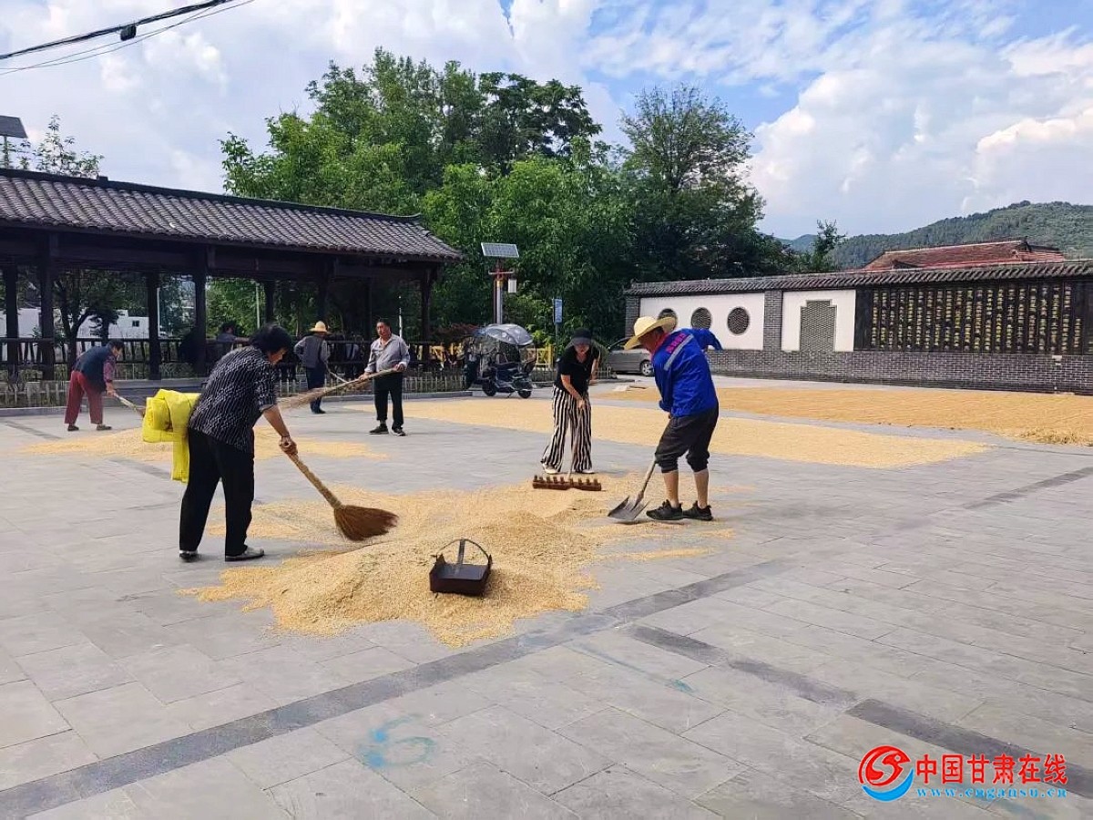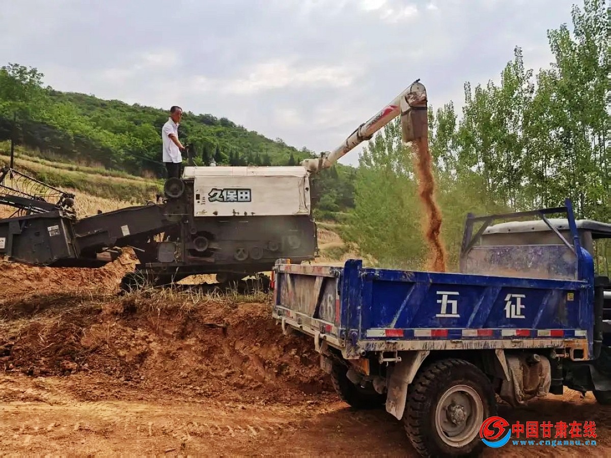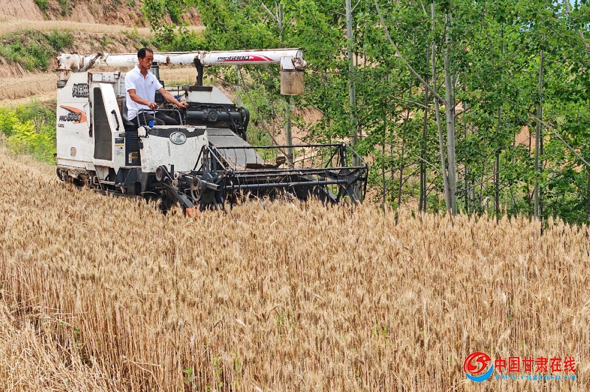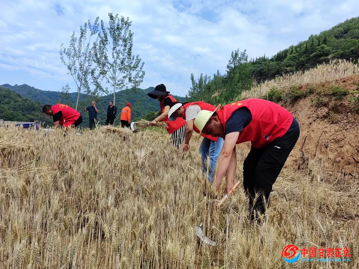 中国甘肃在线两当讯 喜看田野千重浪,麦穗丰硕,微风拂过沙沙作响,金色的麦穗随风起伏,与蓝天、白云、青山一起,绘成一幅诗意的乡村丰收画卷。近日,两当县城关镇冬小麦收获工作陆续展开,村民们撸起袖子,挥舞着镰刀井然有序地忙碌着,身后是一排排一列列捆扎整齐的麦捆,满目金黄,形成了一道靓丽的风景线。