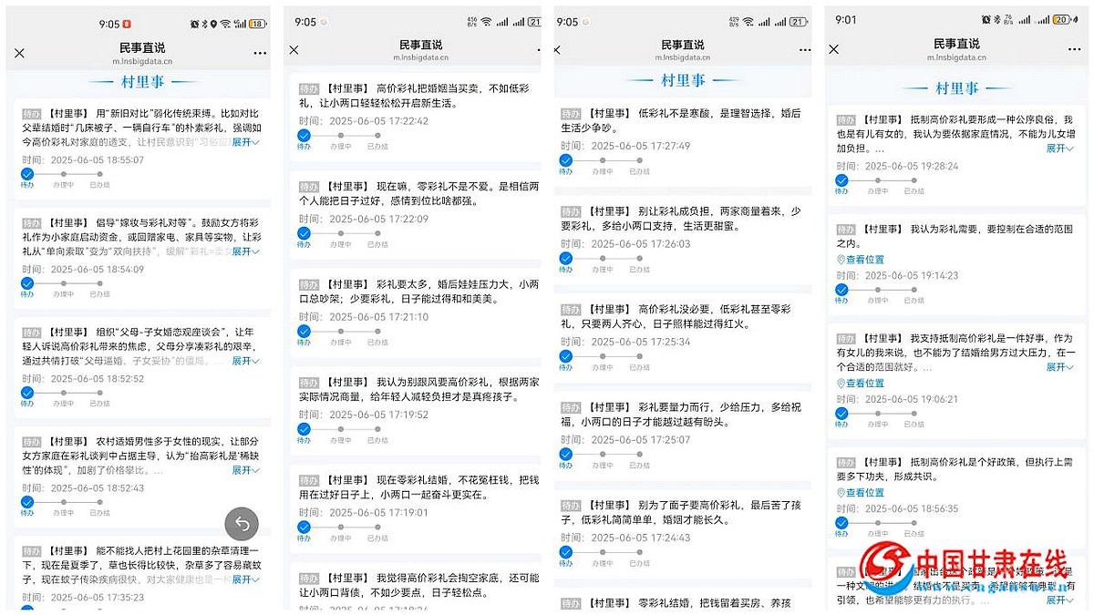云屏镇充分利用陇南民事直说“1234”工作法小平台,围绕“高价彩礼”“铺张浪费”“低俗婚闹”等突出问题征集群众建议,让更多的群众参与到村级发展、乡风文明中来,积极说看法、提建议,让抵制高价彩礼的声音传遍每个角落。截止目前,收集有关高额彩礼事项135条,云屏镇将高度重视收集到的意见和建议,将其作为开展农村高额彩礼问题综合治理工作的“指南针”。