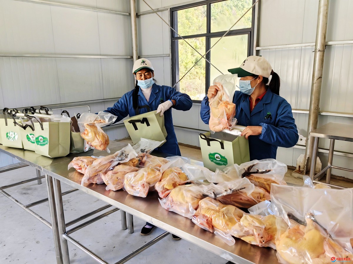 分拣包装车间里,工人们正将刚屠宰处理的樱桃鸡真空密封、装箱冷链,500余只的订单正待发往各地 。