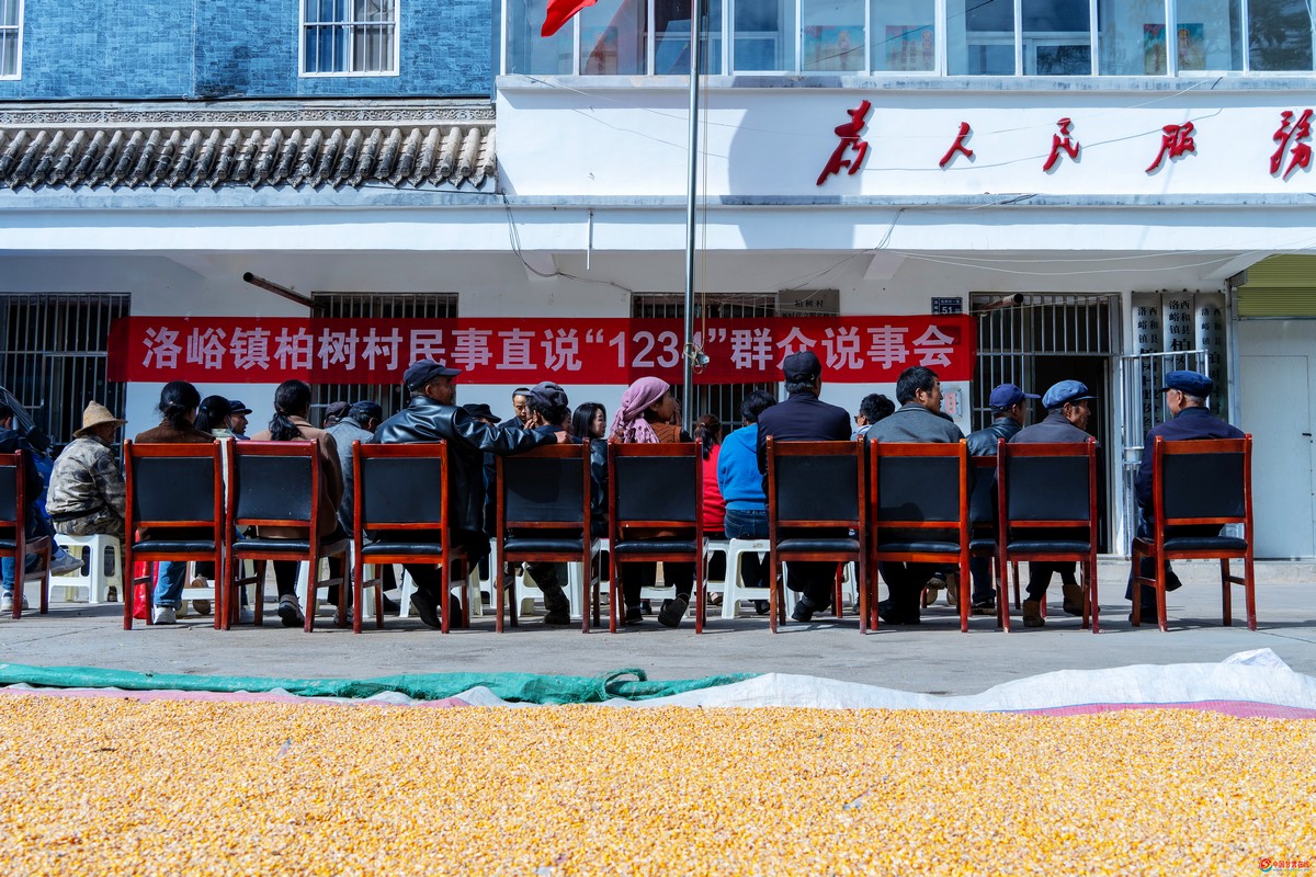 在柏树村村委会门前的广场上,一场村民民事直说群众说事会在蓝天白云下展开,村民一边晾晒谷物一边和村干部讨论合作医疗缴存、人居环境卫生整治的事。