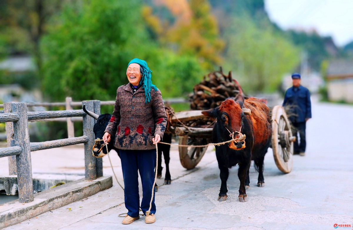 青林村的秋,是沾着烟火气的暖。伴着村旁潺潺流淌的溪流,一辆传统的牛拉车缓缓驶过。木轮碾过石板路,发出“吱呀”声响,像是在哼唱一首关于岁月的民谣。拉车的老牛步伐稳健,棕毛泛着油亮光泽,车斗里码得整整齐齐的柴火,是村民为寒冬储备的取暖物资。