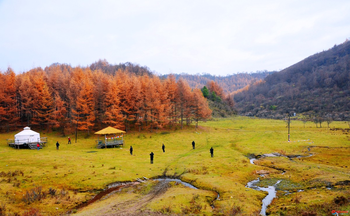 永固滩的秋,是草甸的辽阔与山林的静美交相辉映。金黄的落叶松林环绕着草甸,草色虽渐次泛黄,却仍透着坚韧的生机。几顶特色休憩帐篷散落在草甸之上,为这片土地增添了几分别样风情。