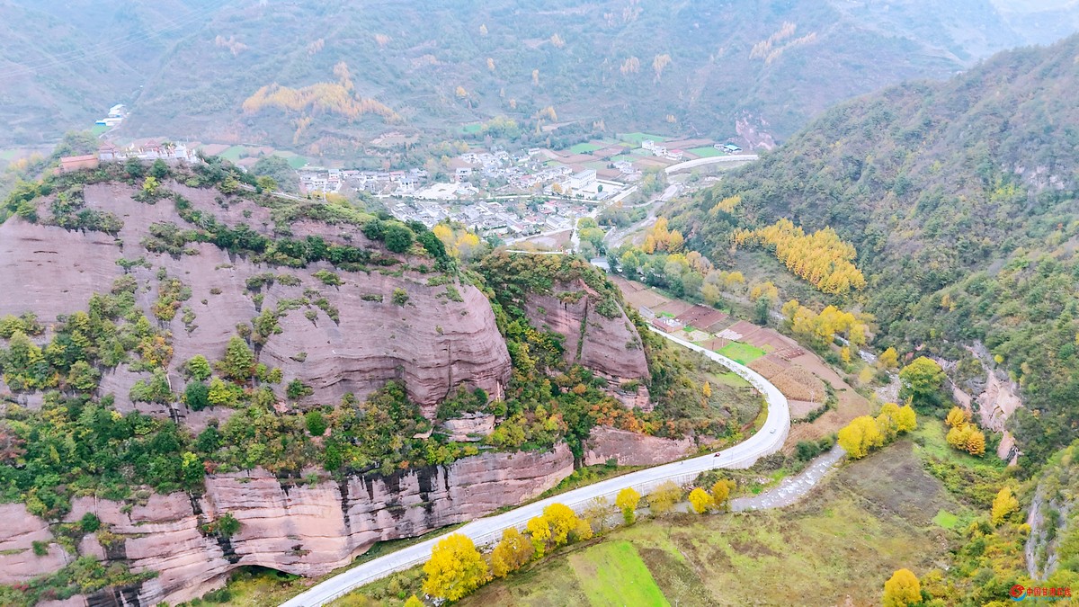 那矗立大堡村旁的丹霞岩壁,经秋风摩挲、秋雨点染,如大地晾晒的巨幅红绸,在群山间铺陈开壮丽底色。岩壁上错落的植被,绿的深沉、黄的明丽,恰似画师随性点染的色块,为赤红丹霞添了几分灵动。山脚下的大堡村,屋舍错落排布,在丹霞与彩林的映衬下,宛如镶嵌在自然画框里的烟火明珠。蜿蜒的乡村公路如银蛇穿梭,一头系着丹霞的雄浑,一头牵着村落的温馨,引着秋光深入每一条巷陌。