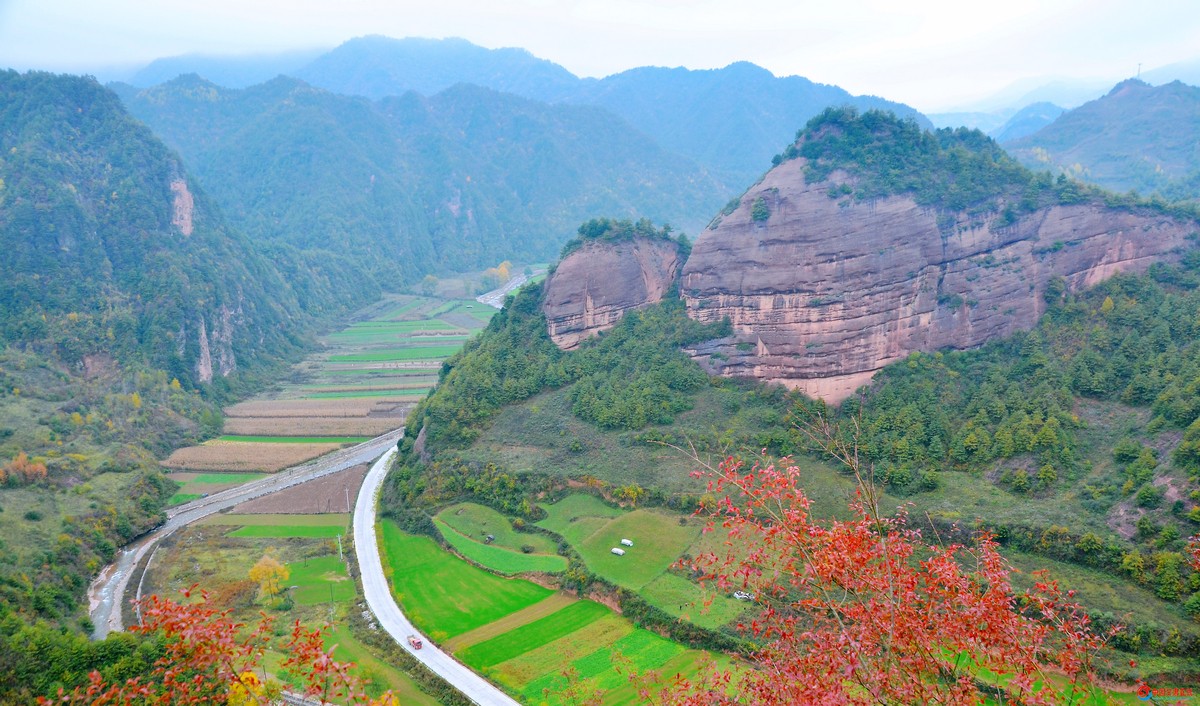 那两座相依相偎的山峰,是时光雕刻的姐妹,在秋阳下沉默伫立。岩壁上的纹理如岁月镌刻的掌纹,每一道沟壑都藏着季节的私语。山脚下的田垄仍留存着农耕印记,绿色菜畦与褐色土地交错纵横,恰似大自然随手铺就的调色盘;蜿蜒的乡村公路如银带般缠绕其间,系在丹霞与林海的交界处,引着旅人探寻更深沉的秋意。