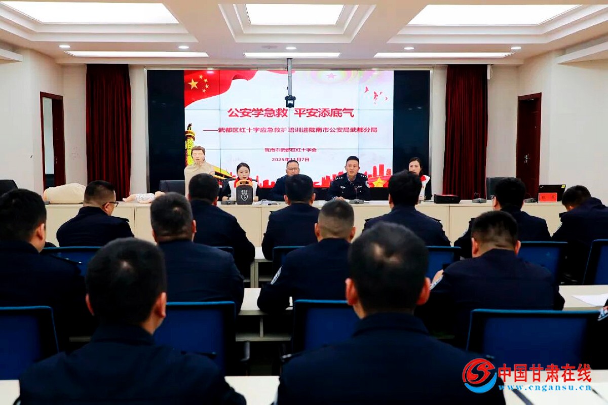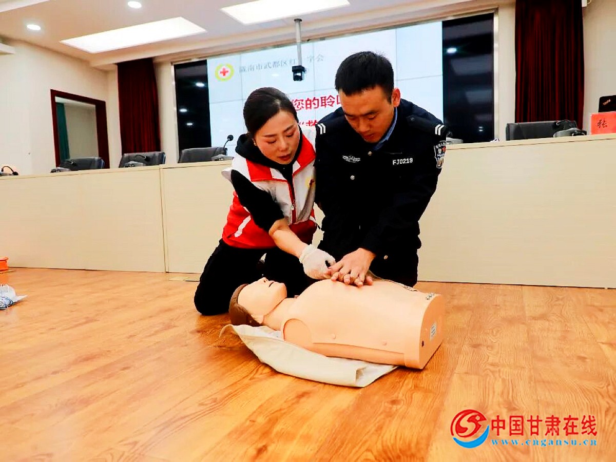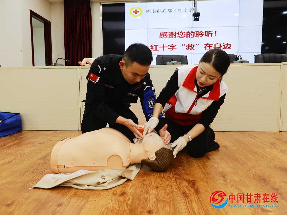 中国甘肃在线武都讯(通讯员:郭玺 杜让珍)为切实提升公安民辅警的急救技能,增强应对突发事件时的应急处置能力。近日,陇南市公安局武都分局联合武都区红十字会举办第四季度心肺复苏和AED应急急救知识专项培训,全局43个一线部门小教官参训。