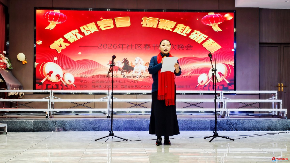 演出开始前,城关镇人民街社区党总支书记、居委会主任马海霞向到场的各位领导、嘉宾及全体社区居民致以诚挚的新春祝福,并向哈达铺老战士艺术团全体成员致以崇高敬意。她说:这些银龄红色文艺志愿者们曾身披戎装、戍边卫国,守护家国安宁;退役后初心不改、本色不变,以文艺表演为载体传承红色基因,用歌声与舞姿践行初心使命,既是社区弥足珍贵的精神财富,也是广大青少年学习的榜样标杆。这场文艺汇演不仅是一场视听盛宴,更是一堂生动鲜活的爱国主义教育课,为社区精神文明建设注入了强劲的红色动能。她还表示,社区将持续搭建多元化群众文化舞台,不断丰富居民精神文化生活,让文明新风吹遍街巷角落,让邻里情谊凝聚成共建共治共享美好家园的强大合力。