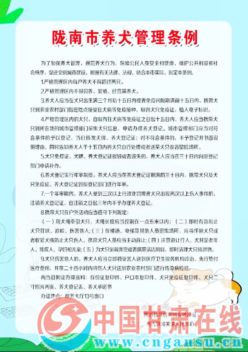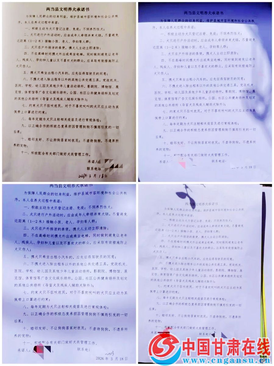 入户中,工作人员采取逐户敲门的方式,对辖区内养犬情况进行地毯式摸排,详细了解犬只数量、种类、免疫及登记办证情况,建立健全养犬信息台账,切实做到“底数清、情况明”。针对未办理养犬登记证的居民,工作人员耐心讲解办证流程与所需材料,引导群众主动前往社区或指定服务点为爱犬办理“身份证”,从源头上规范养犬管理。同时,通过现场讲解典型案例、普及《陇南市养犬管理条例》、签订文明养犬承诺书等方式,向居民广泛宣传依法养犬、安全养犬、卫生养犬、健康养犬的重要性,重点强调携犬外出必须束犬链、主动避让行人、及时清理犬只粪便等文明要求,积极倡导居民养成“遛狗必牵绳、粪便必清理”的良好习惯,共同维护干净整洁、和谐宜居的社区环境。