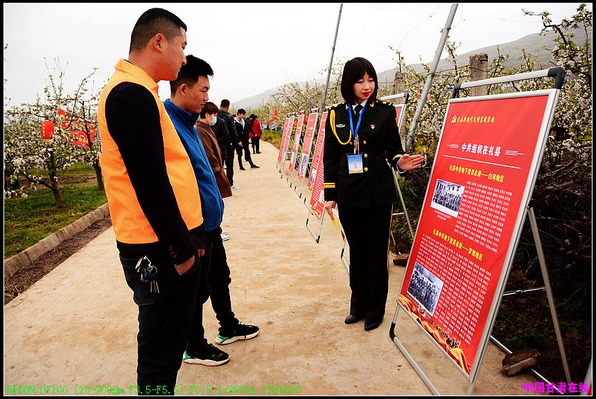 • 礼县“苹果花开.;探秘秦源”学党史活动中工作人员为游客讲解党史知识
