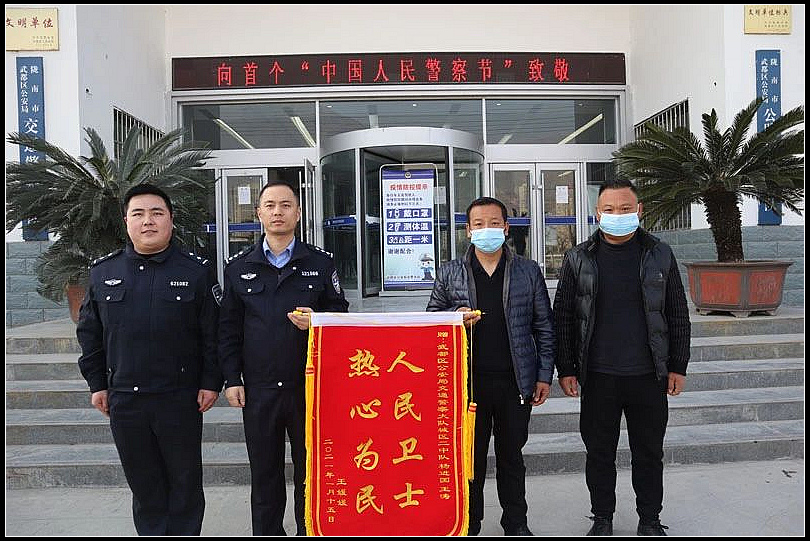 中国甘肃在线武都讯(通讯员 赵振 茹芳丽) 2月3日上午,市民王先生拿着一面写有“人民卫士 热心为民”的锦旗,送到武都区公安局交警大队,激动地向民警说:“感谢民警捡到钱包并及时送还,丢了钱包后我根本没想到能找回来,更没想到这么短的时间就找回