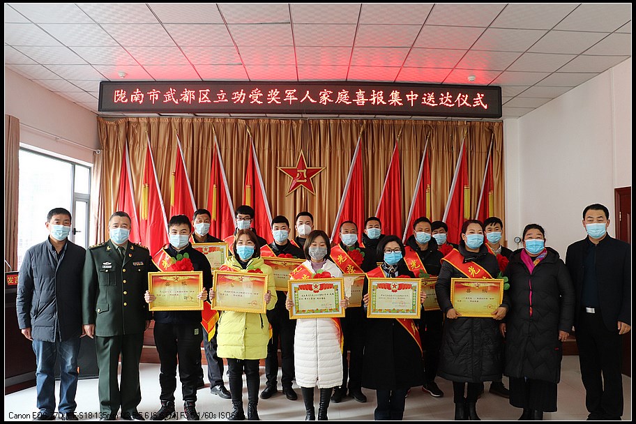 1月25日,在甘肃省陇南市武都区人武部八楼会议室,14位家长一桌一座,身披绶带,胸别红花,脸上洋溢着幸福的笑容,期待着即将开始的颁奖典礼。上午9点,武都区人武部会同退役军人事务局召开立功受奖家庭集中送喜报仪式,为全区2020年立功受奖军人家