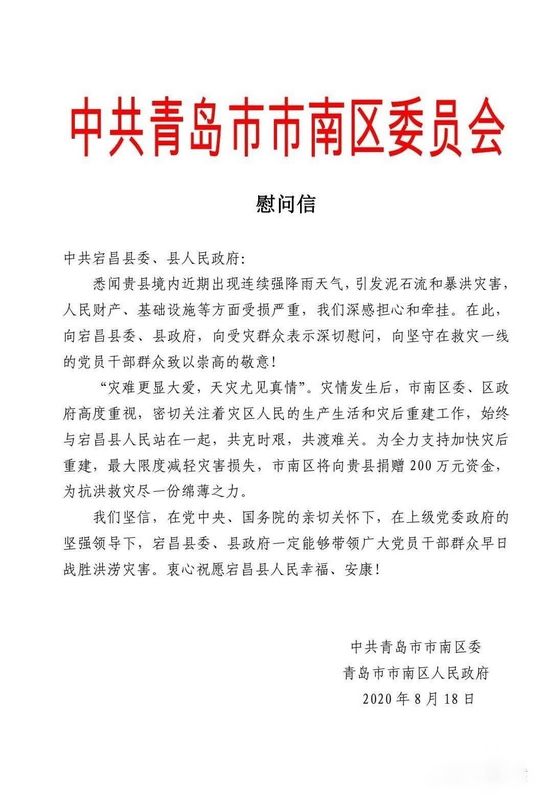 • 青岛市市南区向宕昌县捐赠专项救灾资金200万元