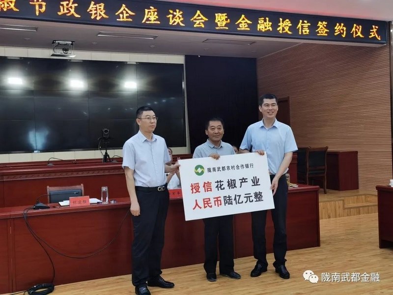 本网武都讯(通讯员 周红霞)盛夏七月,椒香四溢。近日,武都区组织召开了以“金融助力产业发展,信贷融活椒香天下”为主题的政银企座谈会暨授信签约仪式,辖区内银行业金融机构向我区花椒产业发展总授信9.65亿元。武都合行、邮储银行陇南分行、农行武