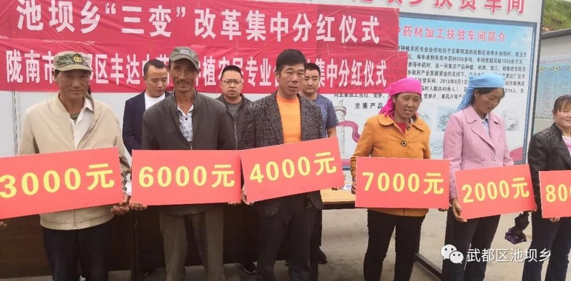 “感谢党和政府对我们贫困户的产业帮扶,感谢党和政府对我们贫困户的关心,拿着今年的分红,我对未来的日子更坚定了信心……”。贫困户孙张军拿着分红得到的4000元大红包开心的说。7月14日,武都池坝乡举行“三变”改革暨丰达合作社带贫集中分红大会,