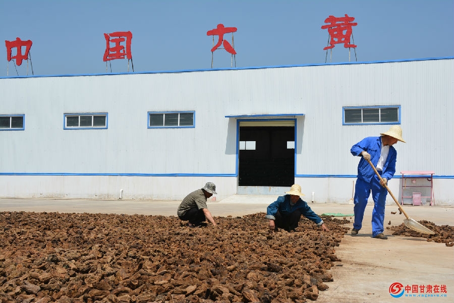 近年来,礼县积极探索创新产业扶贫模式,出台完善奖励激励政策,坚持把产业扶贫作为帮助贫困群众稳定脱贫的治本之策,通过发展“公司+基地+合作社+农户”的模式,促进贫困户脱贫增收。图为礼县鑫盛源大黄生产基地工人