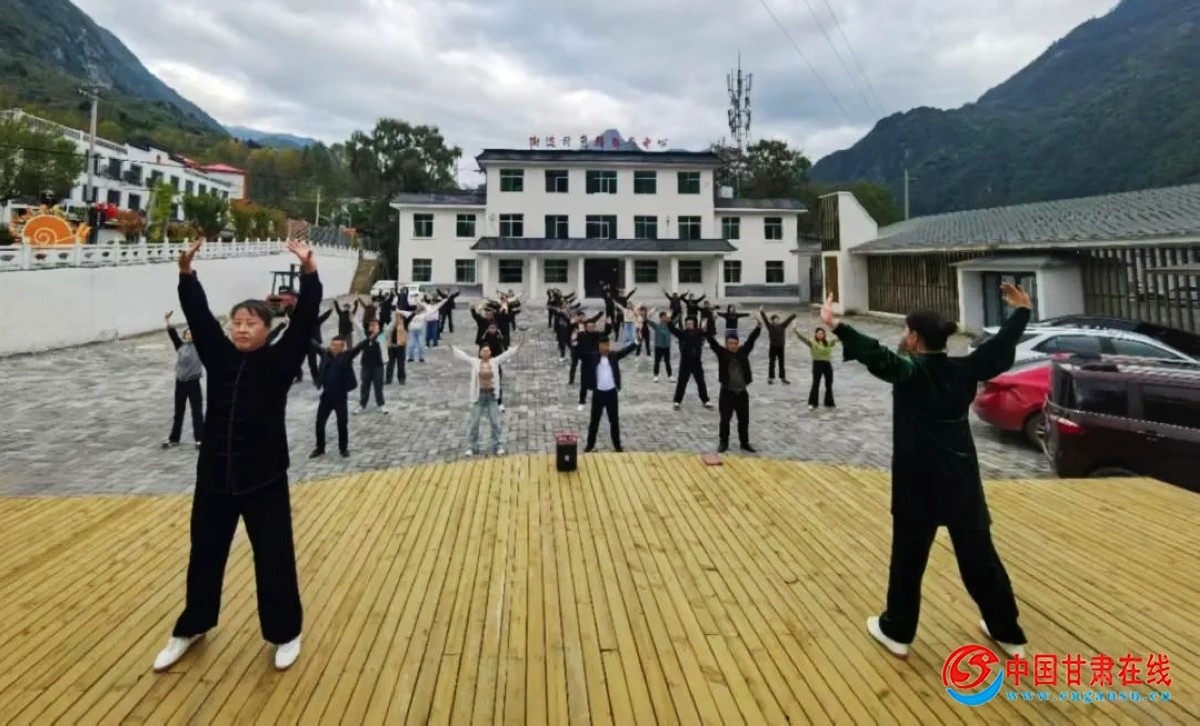 中国甘肃在线两当讯 为加快办理县政协在云屏长寿之乡推广太极拳的提案,10月14日,两当县文旅局邀请八段锦专业老师前来云屏镇进行现场教学,倡导广大群众养成健康的养生锻炼方式。教学现场,伴随着悠扬的音乐,我镇干部、群众跟着老师们一招一式练起来。