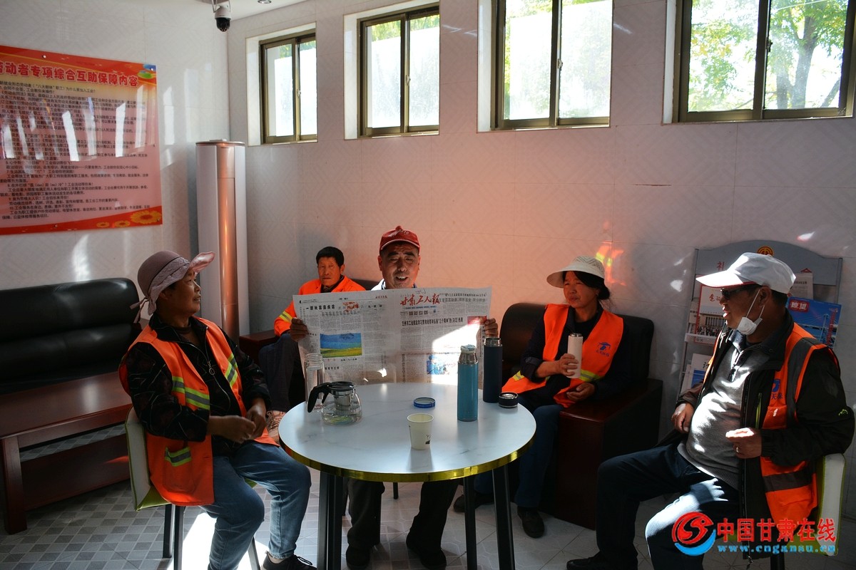 中国甘肃在线礼县讯(通讯员:王喜平)10月23日中午礼县环卫工人,在礼县水上公园爱心驿站,喝水休息、读看《甘肃工人日报》。礼县工会专人看管爱心驿站,为户外工作者开放服务,提供充电、休息喝热水服务。还为户外劳动者提供精神食粮,休息时间还可以读
