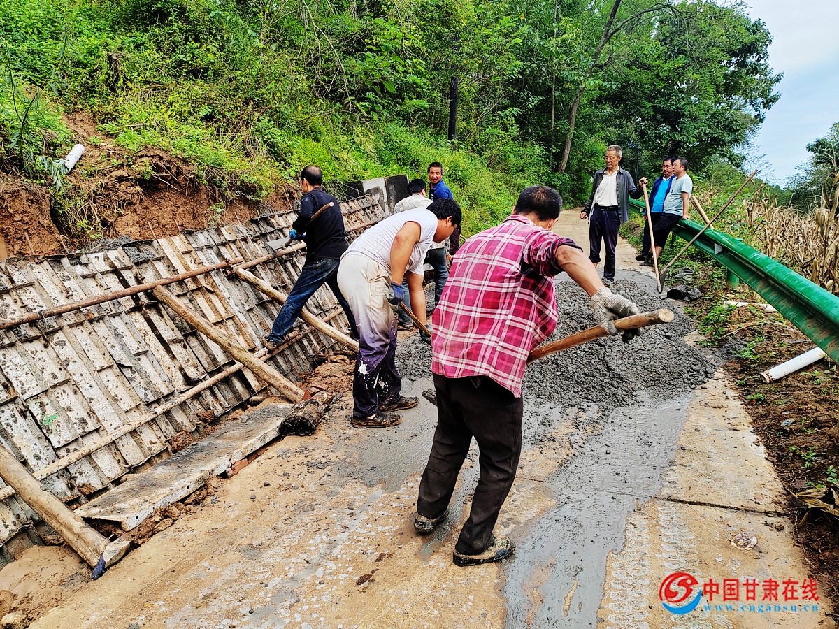 中国甘肃在线徽县讯(通讯员 马育江)人心齐,泰山移。近日,在徽县永宁镇高庙村水毁路修复现场,村干部与村上10多名村民奋战在暴雨冲垮路段,修复地基,疏通路面,有序进行灾后重建。2024年7月22日,受暴雨影响,徽县永宁镇境内通村路、通社路不同