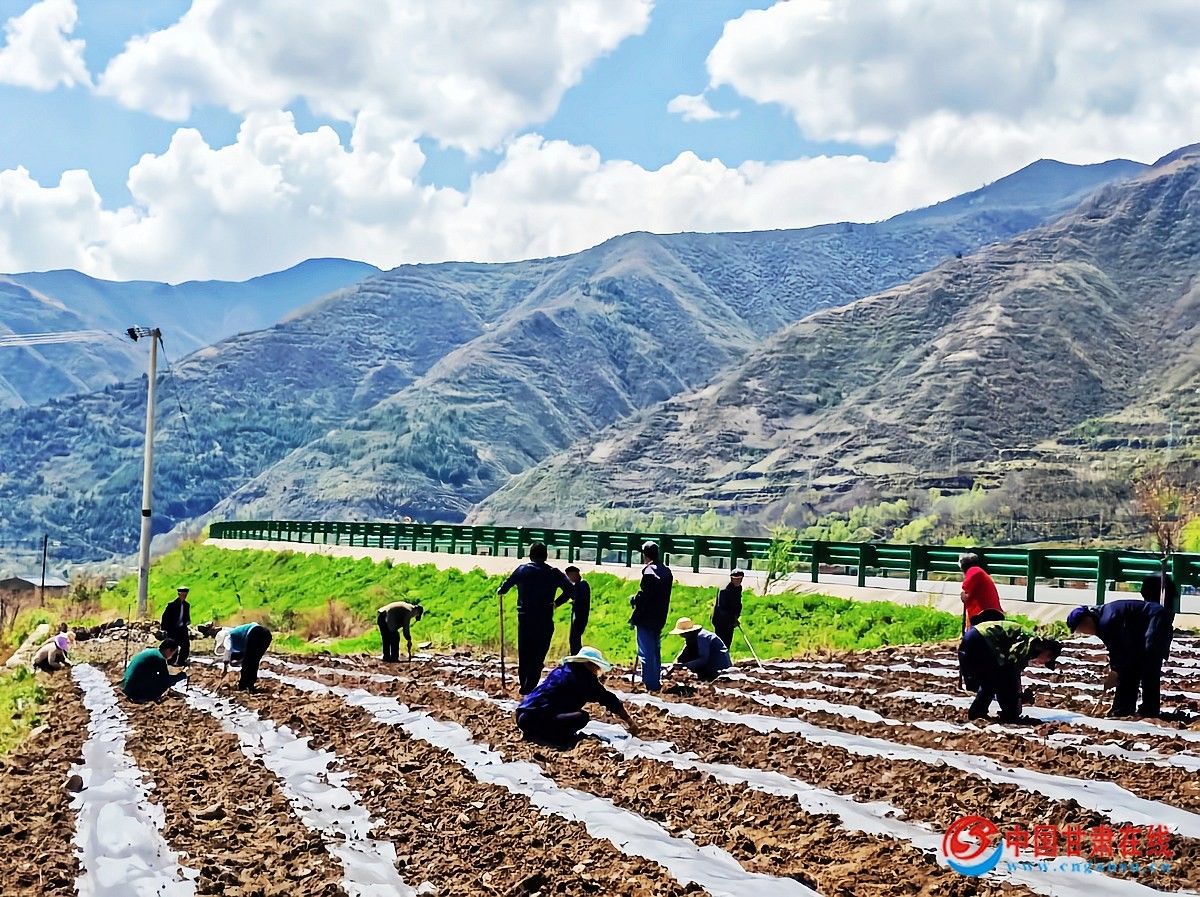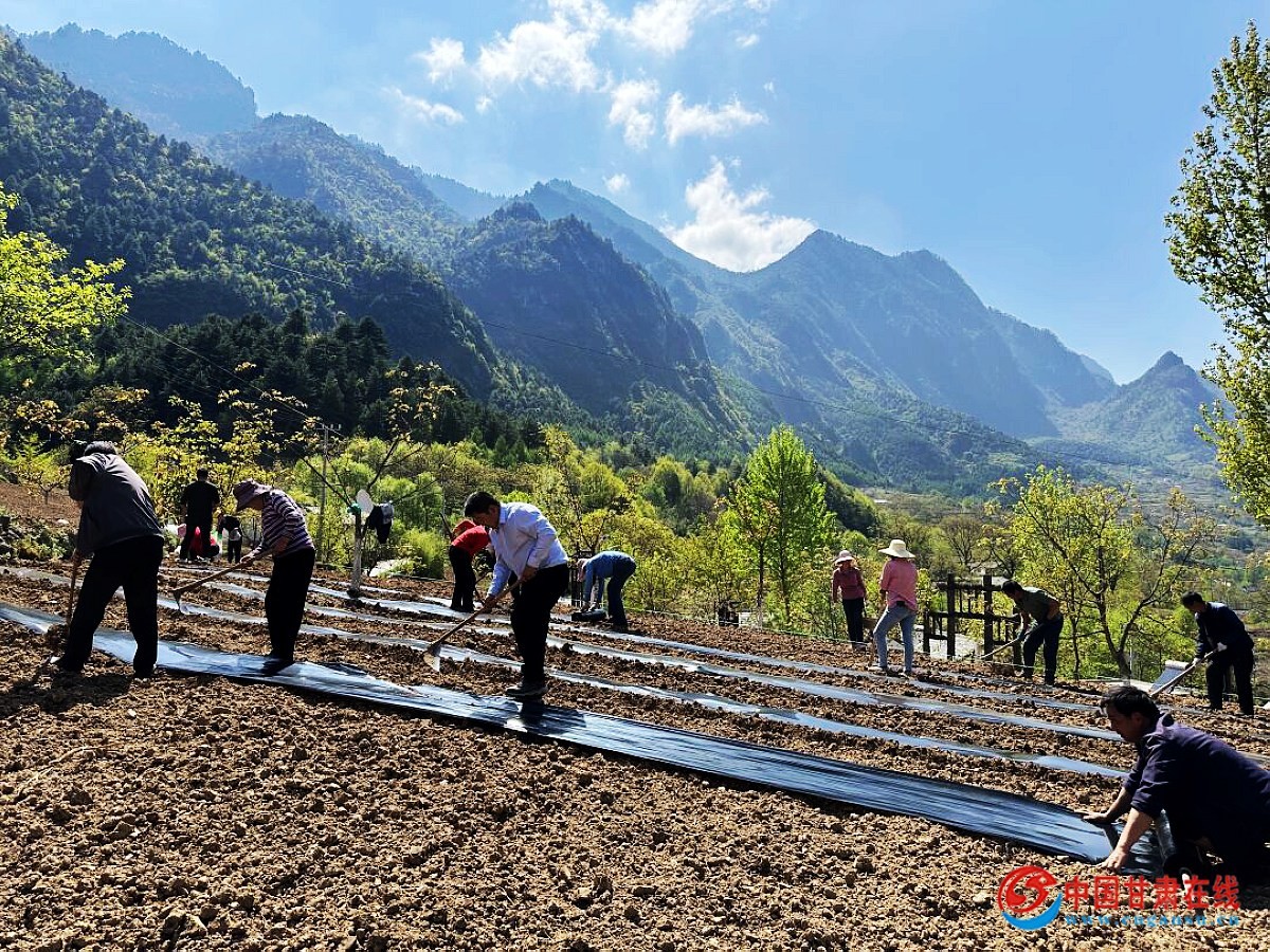 中国甘肃在线两当讯 春来种下致富苗,待到秋时菊满园,春意盎然的四月天,走进两当县云屏镇亳菊种植示范点,村民们正在地里来回穿梭,起垄、施肥、盖膜,一行行覆好地膜的垄梗整齐划一,在阳光的照耀下宛如一条条丝带,勾勒出一副人勤春光美的和美春耕画卷。