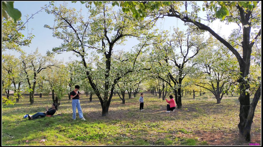 • 游客在礼县永兴镇友好村百亩梨花园中拍照留念