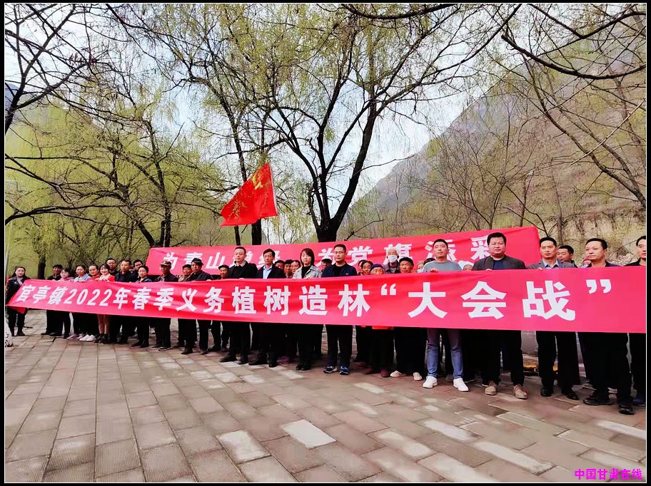 中国甘肃在线宕昌讯 最是一年春好处,植树添绿正当时。3月12日,官亭镇组织全镇干部职工及各村群众扎实开展2022年春季植树造林“大会战”活动,挖大坑,浇大水,种好树,为青山添绿 党旗添彩。三埋两蹋一提苗,挖坑浇水保成活。植树现场,干部职工和