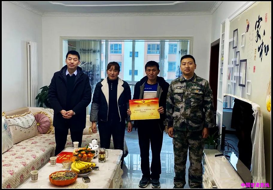 中国甘肃在线武都讯(通讯员 王骞瑶)“一人当兵,全家光荣。”一张喜报,不仅是军人荣誉的象征、成长进步的见证,也承载着每个军属的期盼与慰藉。2月23日,蒲池乡党委书记王鸿来带领乡武装部负责人、乡退役军人服务站负责人为荣获2021年“四有”优秀