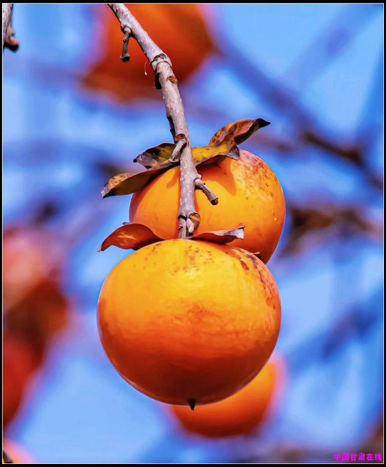 中国甘肃在线武都讯 (通讯员: 赵春兰 赵玉琴)初冬时节,走进武都区玉皇乡,放眼望去,嶙峋的枝条上挂满一簇簇、一丛丛、火红的柿子把福津河两岸的寂静的山野点亮。一入冬,树叶几近凋零,犹有几片还悬挂在枝桠上映衬着成熟饱满的柿子,温暖的阳光洒下
