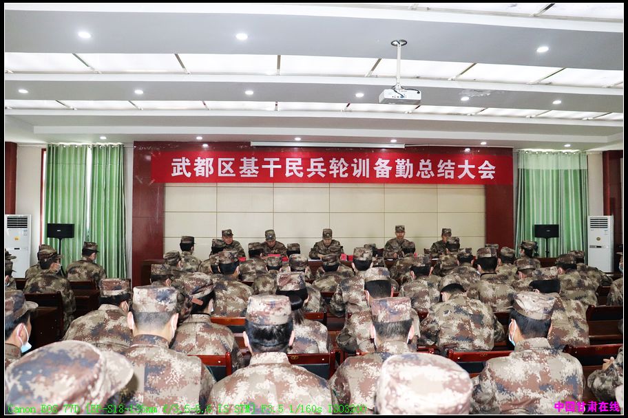 中国甘肃在线武都讯 12月17日,在市民兵训练基地,武都区人武部组织召开2021年度基干民兵轮训备勤总结大会,会议由人武部副部长郭俊强主持,区委常委、人武部政委游成峰出席会议并发表讲话。会议在庄严的中国人民解放军军歌中开幕,会议宣读了《关于