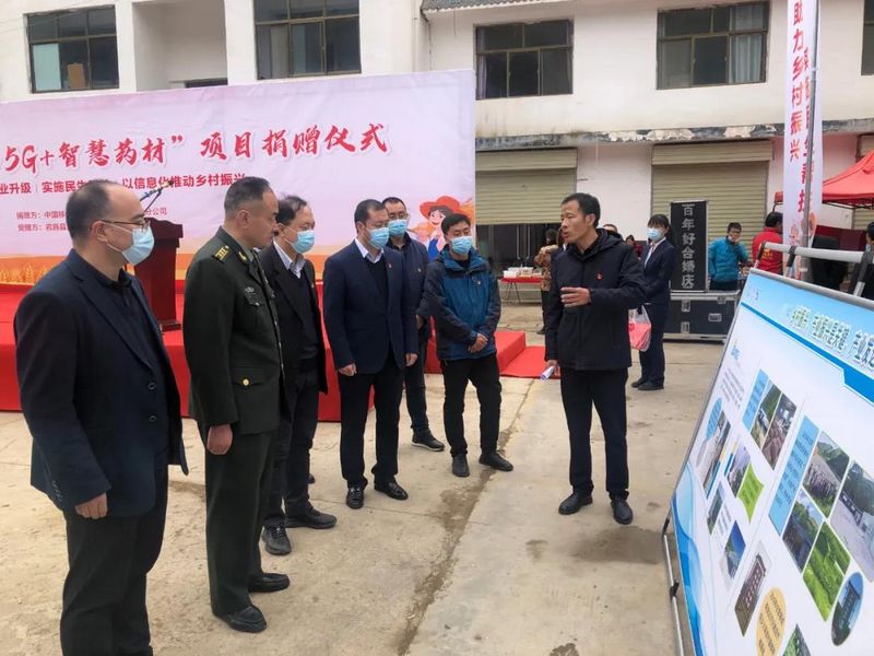 11月27日,中国移动通信集团甘肃有限公司乡村振兴“宕昌5G+智慧药材”项目捐赠仪式在宕昌县竹院乡举行。县人武部政委胡义文,副县长王硕,中国移动通信集团甘肃有限公司陇南分公司党委委员、副总经理刘建鹏,中移(成都)信息通信科技有限公司西北区域