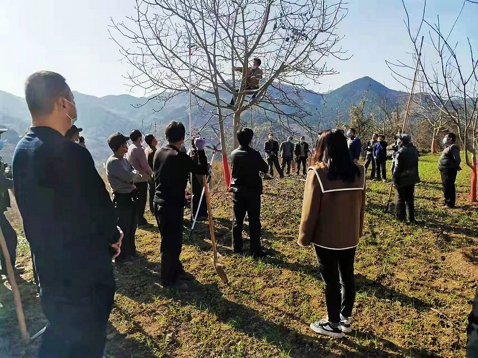 中国甘肃在线成县讯(通讯员张文镜)11月9日,随着新一轮寒潮过后气温回暖的有利时节,在索池镇王湾村冬季核桃树综合管护工作示范点,镇村干部、林业站技术人员、驻村帮扶工作队正在有效开展疫情防控工作的同时戴着口罩,手拿铁锹、修剪工具等给全村核桃树