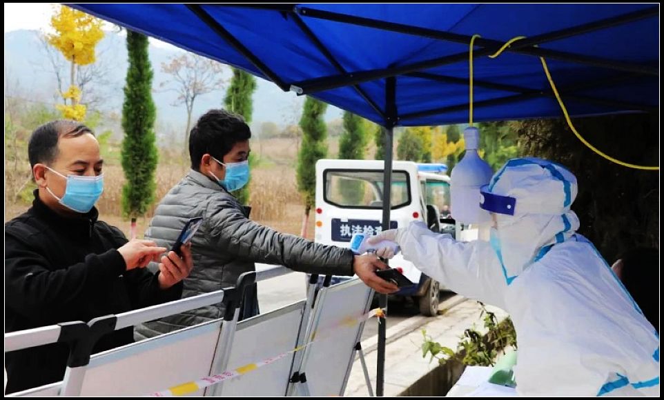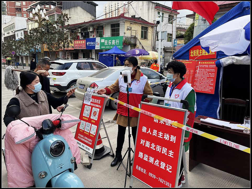 中国甘肃在线徽县讯(通讯员 郭鸿飞 田晗)“您好,请到这边扫描出行码、密接码、测量体温进行登记”。徽县城关镇金徽社区疫情监测点志愿者梁瑞波向前来社区的一名女士亲切地说到。面对突如其来的新一轮疫情,徽县干部职工积极响应,主动请缨,投身到街道、