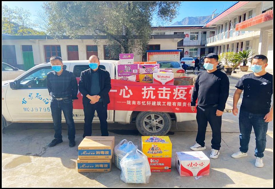 中国甘肃在线武都讯(通讯员 杨文丽)越是危难时刻,越显责任担当,越到艰难险阻,越显人间大爱。陇南市忆轩建筑工程有限责任公司向坪垭、洛塘、三河等乡镇疫情防控一线捐赠方便面147箱、矿泉水79件、消毒液6件、医用口罩3000个等抗疫物资,助力乡
