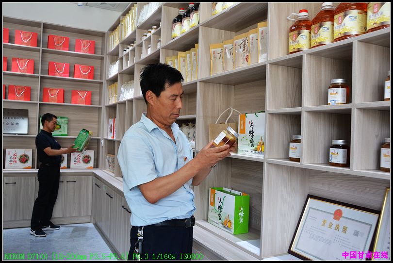 礼县雷坝镇蒲陈村扶贫车间负责人蒲旭东查看“蒲礼源”系列产品。近年来,该村在西北师范大学的帮扶下,组建了以“生产+加工+销售”为一体的农产品消费扶贫车间。据了解,该车间年销售额达230多万元,通过利用电子商务线上销售、市场实体线下消费和对口帮
